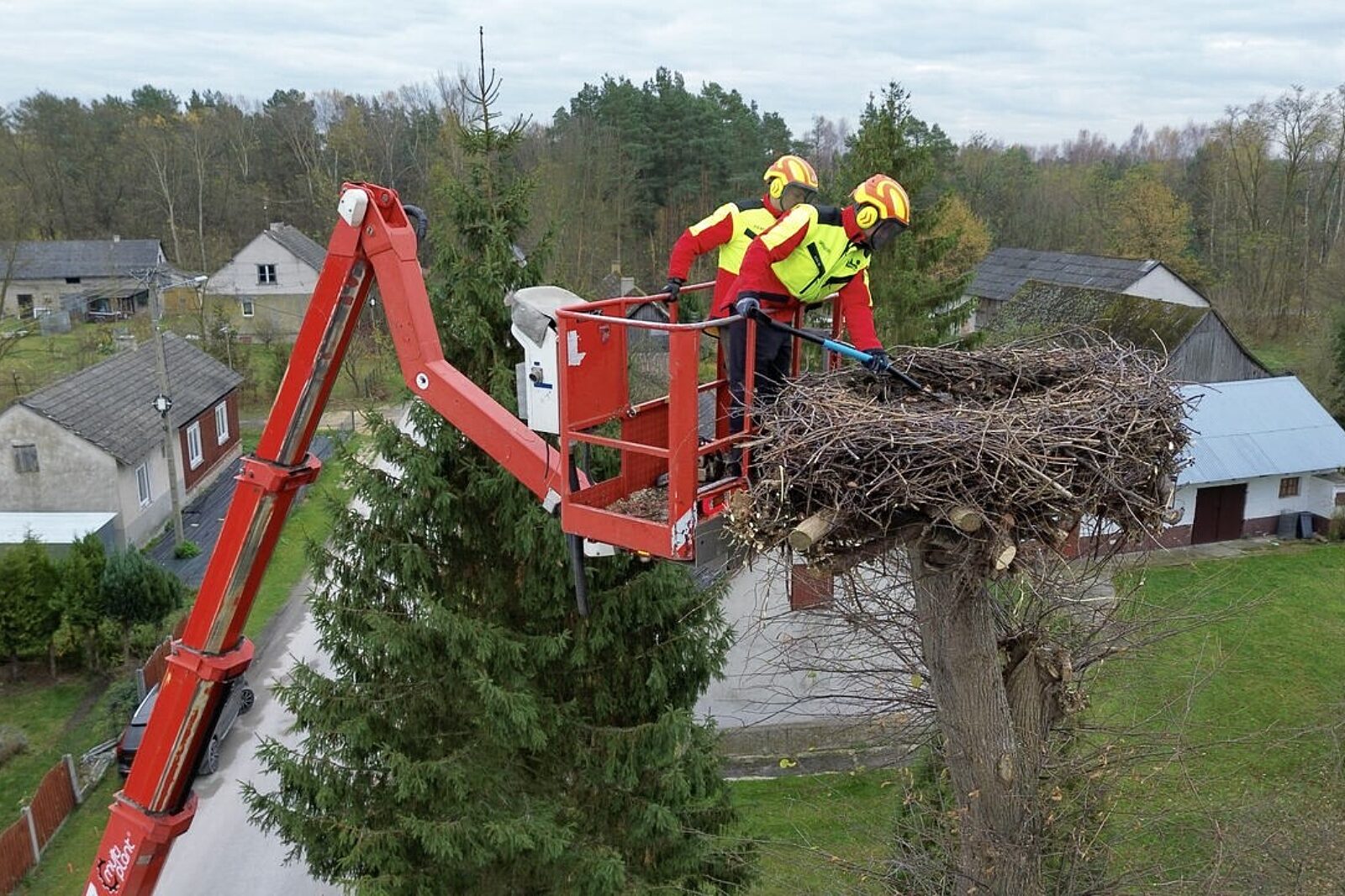 Zabiegi pielęgnacyjne przy gnieździe bocianim w Kuźnicy Wąsowskiej