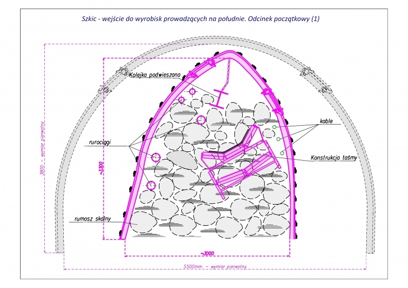 • stwierdzone uszkodzenia obudowy w chodniku badawczym "5b", które prawdopodobnie wystąpiły również w północnym odcinku ściany (brak możliwości wejścia do ściany), w dowierzchni badawczej "1", w rejonie projektowanego chodnika ratowniczego "1" zabudowany jest napęd przenośnika taśmowego,