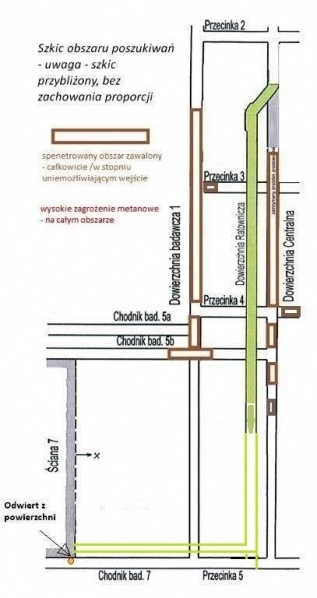 Do przecinki "5", czyli chodnika prowadzącego w miejsce, gdzie spodziewamy się, że znajduje się przynajmniej jeden z pracowników pozostało do wydrążenia ok. 121m. (na koniec dnia 1.06) W przypadku możliwości penetracji (wejścia ratowników do przecinki "5") odcinek, którym zastępy ratownicze muszą przejść do miejsca z którego próbowano telefonicznie połączyć się z powierzchnią, ma długość ok. 120-130 m. Gdyby jednak okazało się to niemożliwe pozostanie do wydrążenia kolejny odcinek chodnika ratowniczego 2 w pobliże miejsca w którym wykonany jest otwór ratowniczy z powierzchni - wyjaśnia Wojciech Jaros.