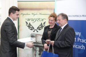 Nagrody - ufundowane m.in. przez kierownictwa spółek górniczych laptopy, aparaty fotograficzne i smartfony - wręczała laureatom Beata Marynowska, Okręgowy Inspektor Pracy w Katowicach wspólnie z wiceprezesem WUG Wojciechem Magierą, w obecności Tadeusza Skotnickiego - wiceprezesa KHW oraz Tadeusza Żesławskiego, wicekuratora oświaty w Katowicach oraz Iwony Szychowskiej, wicedyrektor kopalni Wujek.