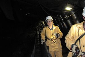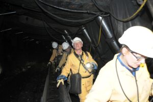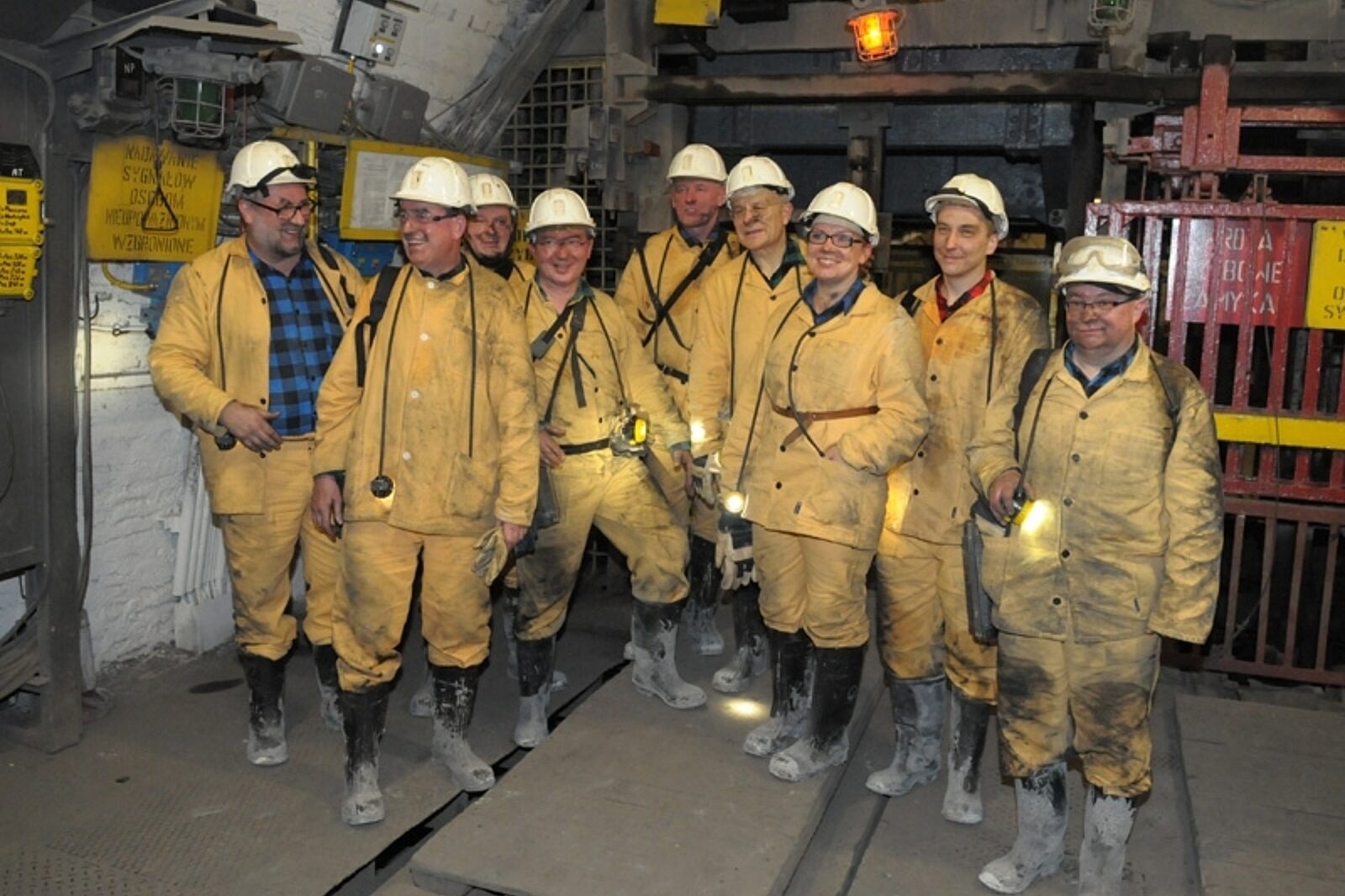 Uczestnicy zjazdu mieli okazję jechać kolejką podwieszaną, następnie przeszli dowierzchnią V do ściany. Samo przejście przez nią wymagało nie lada wysiłku, zwłaszcza w bardzo wąskich przesmykach, gdzie sekcje obudowy dojechały do przenośnika. Chwilę odpoczynku wypełniło obserwowanie pracy kombajnu, której towarzyszyły potężne drgania.