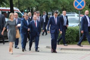 Grupa ok. 60 ratowników górniczych (spośród niemal trzystu, którzy w maju tego roku nieśli pomoc w akcji poszukiwania odciętych pod ziemią po tąpnięciu w kopalni Zofiówka) przywitała w Bytomiu premiera Mateusza Morawieckiego, który w niedzielę, 8 lipca, odwiedził województwo śląskie.