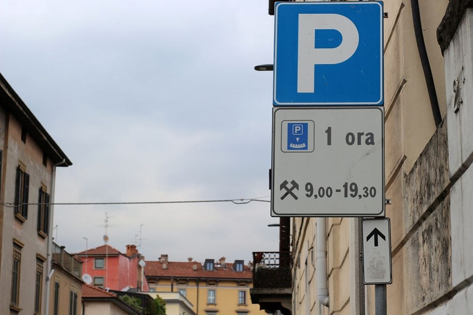 Górnicze młotki na jednym ze znaków drogowych w Bergamo we Włoszech