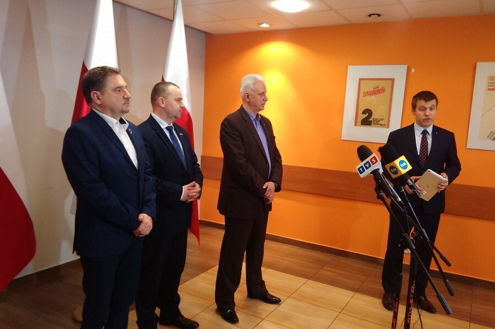 Piotr Duda, szef NSZZ Solidarność, minister Paweł Mucha i Dominik Kolorz, szef śląsko-dąbrowskiej Solidarności podczas briefingu przed debatą z cyklu Wspólnie o Konstytucji