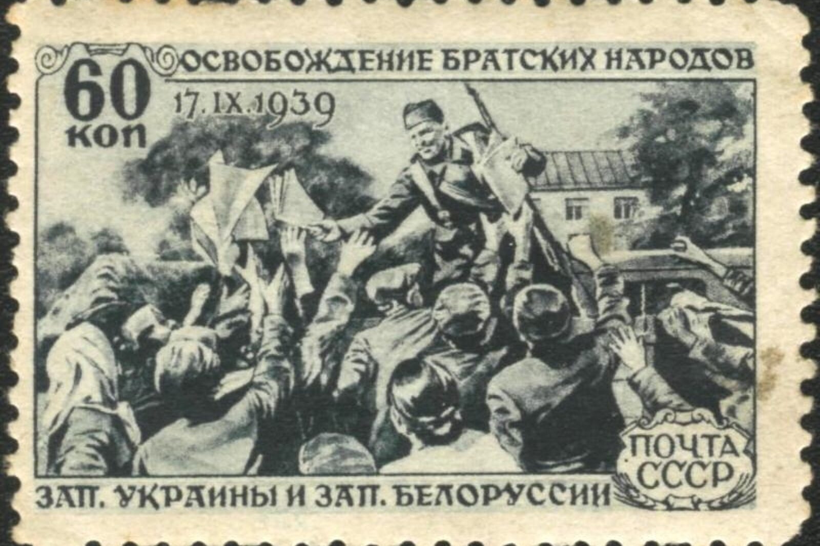 Znaczek sowietski ukazujący "oswobodzenie bratnich narodów zachodniej Ukrainy i zachodniej Białorusi"...