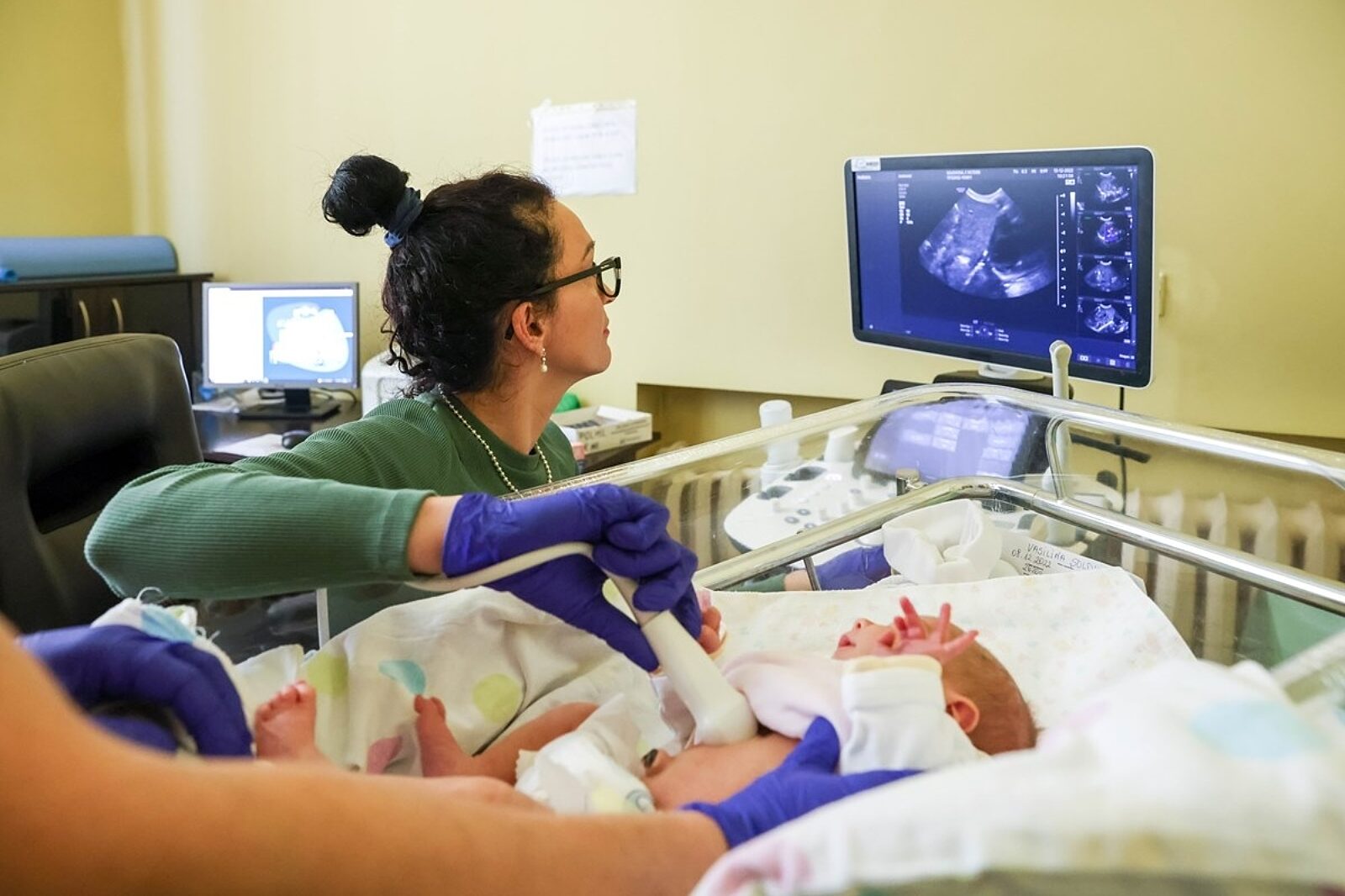 Pani doktor Małgorzata Kwaśnicka przeprowadza badanie USG nową głowicą u noworodka