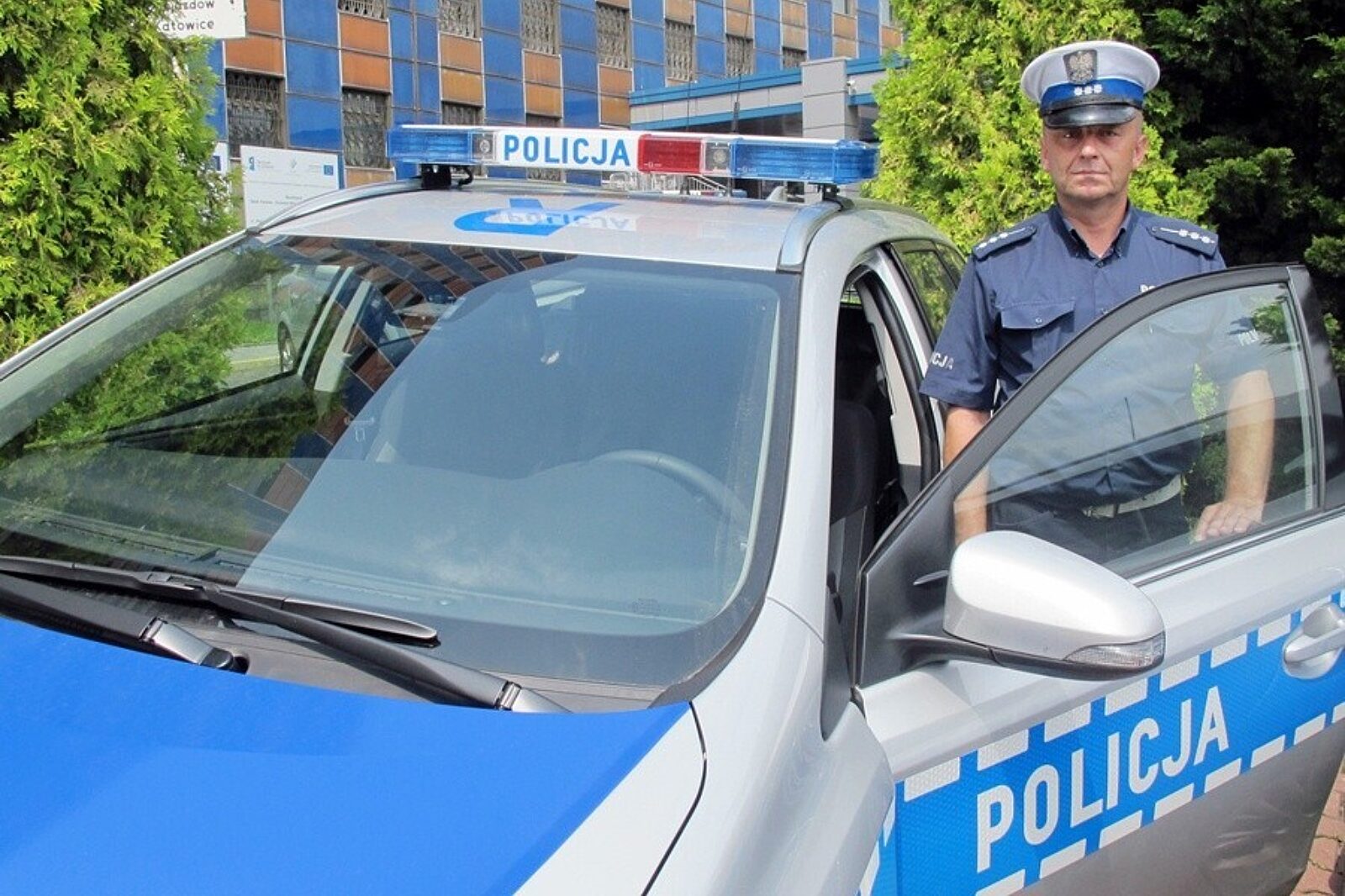 St. asp. Jacek Prokop z Wydziału Ruchu Drogowego Komendy Miejskiej Policji w Katowicach już za moment wyruszy na patrol nowym radiowozem