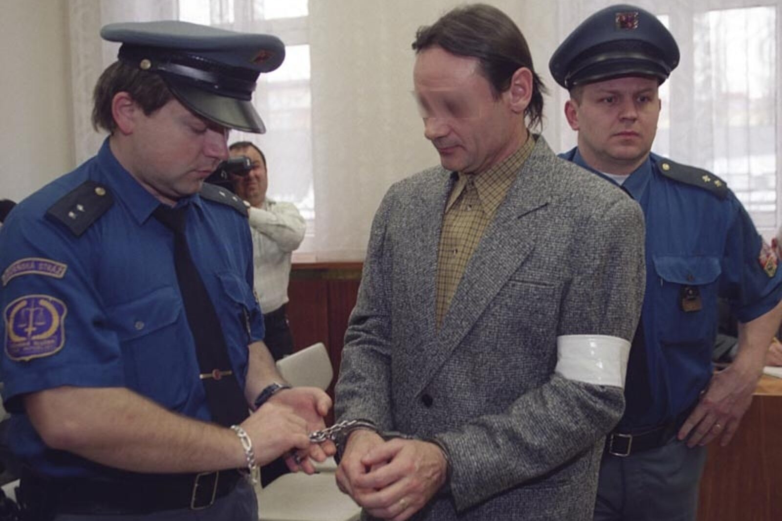 Skazany Milan Sztiepniczka opuszcza sąd w Ostrawie w asyście funkcjonariuszy straży więziennej