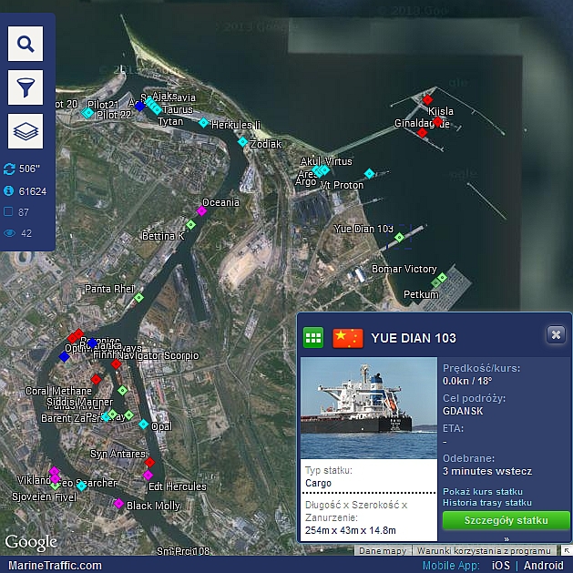 Mapka: położenie statków przy nabrzeżach w Porcie Gdańskim