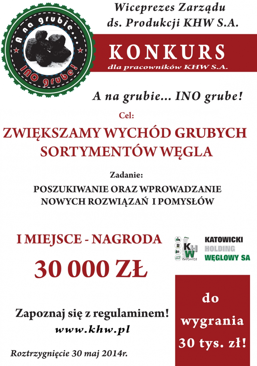 A na grubie ino grube - taką nazwę nosi konkurs dla pracowników zorganizowany przez Katowicki Holding Węglowy - poinformowało portal górniczy nettg.pl biuro prasowe KHW. Jego celem jest kreatywność i rywalizacja w poszukiwaniu oraz wprowadzeniu nowych rozwiązań i pomysłów, które mogą się przyczynić do zwiększenia wychodu grubych sortymentów węgla. Zwycięzca konkursu otrzyma 30 tys. zł. Za miejsce drugie i trzecie przewidziano odpowiednio nagrody w wysokości 15 i 7 tys. zł.