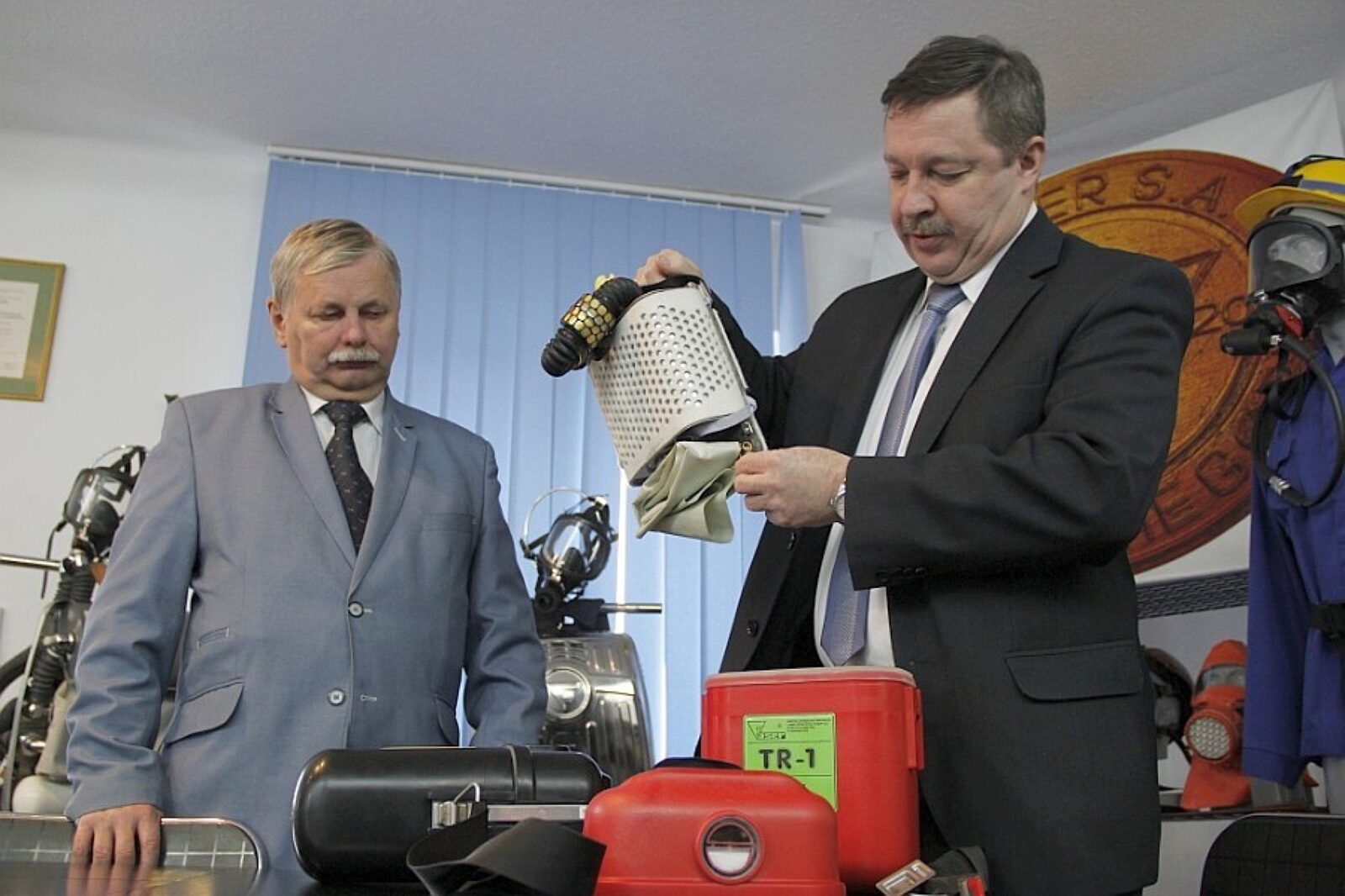 Prezes Jacek Świątek (z lewej) i dyrektor ds. badań i rozwoju Edward Guzy prezentują treningową wersję nowego aparatu ucieczkowego ATU-1