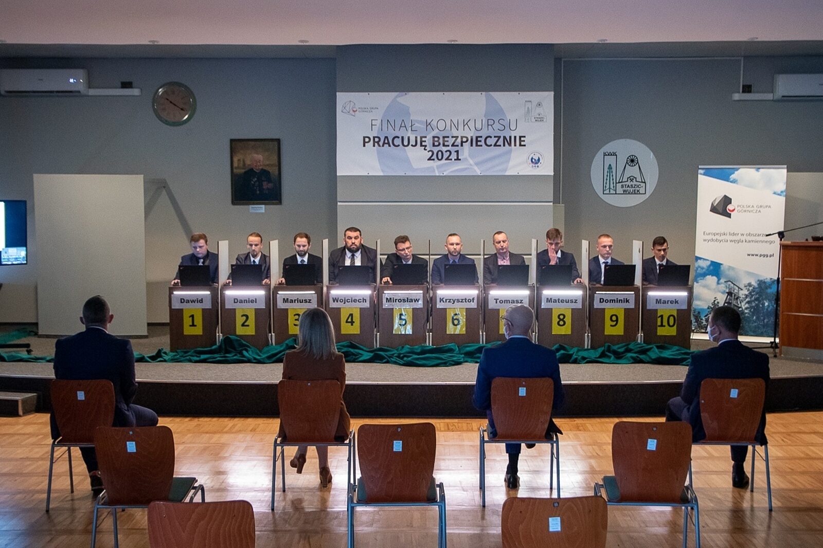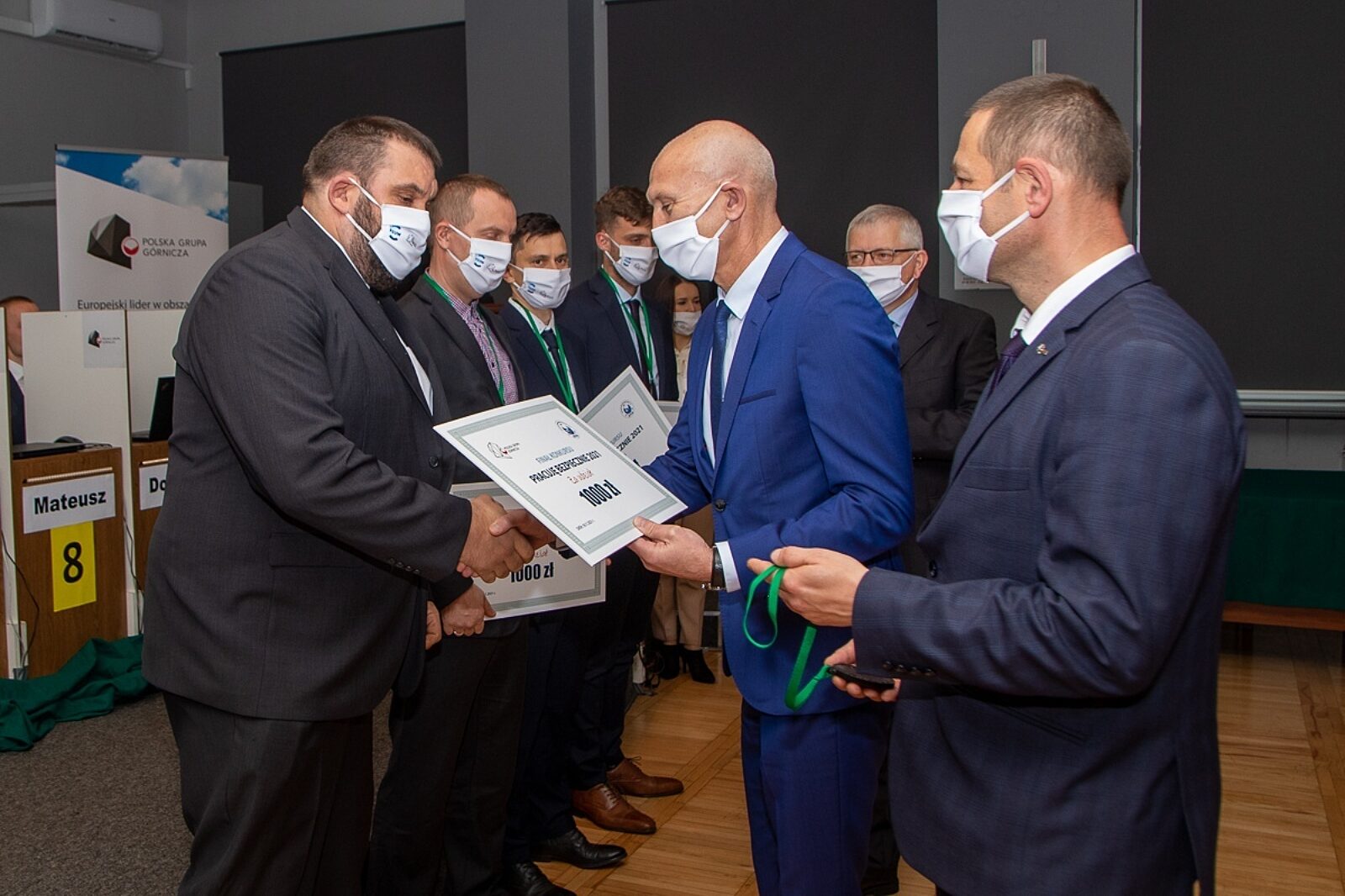 Zwycięzcy konkursu wraz z dyrektorem Damianem Borgiełem (pierwszy z lewej), wiceprezesem PGG Rajmundem Horstem (drugi od prawej) i dyrektorem Grzegorzem Ochmanem (pierwszy z prawej)