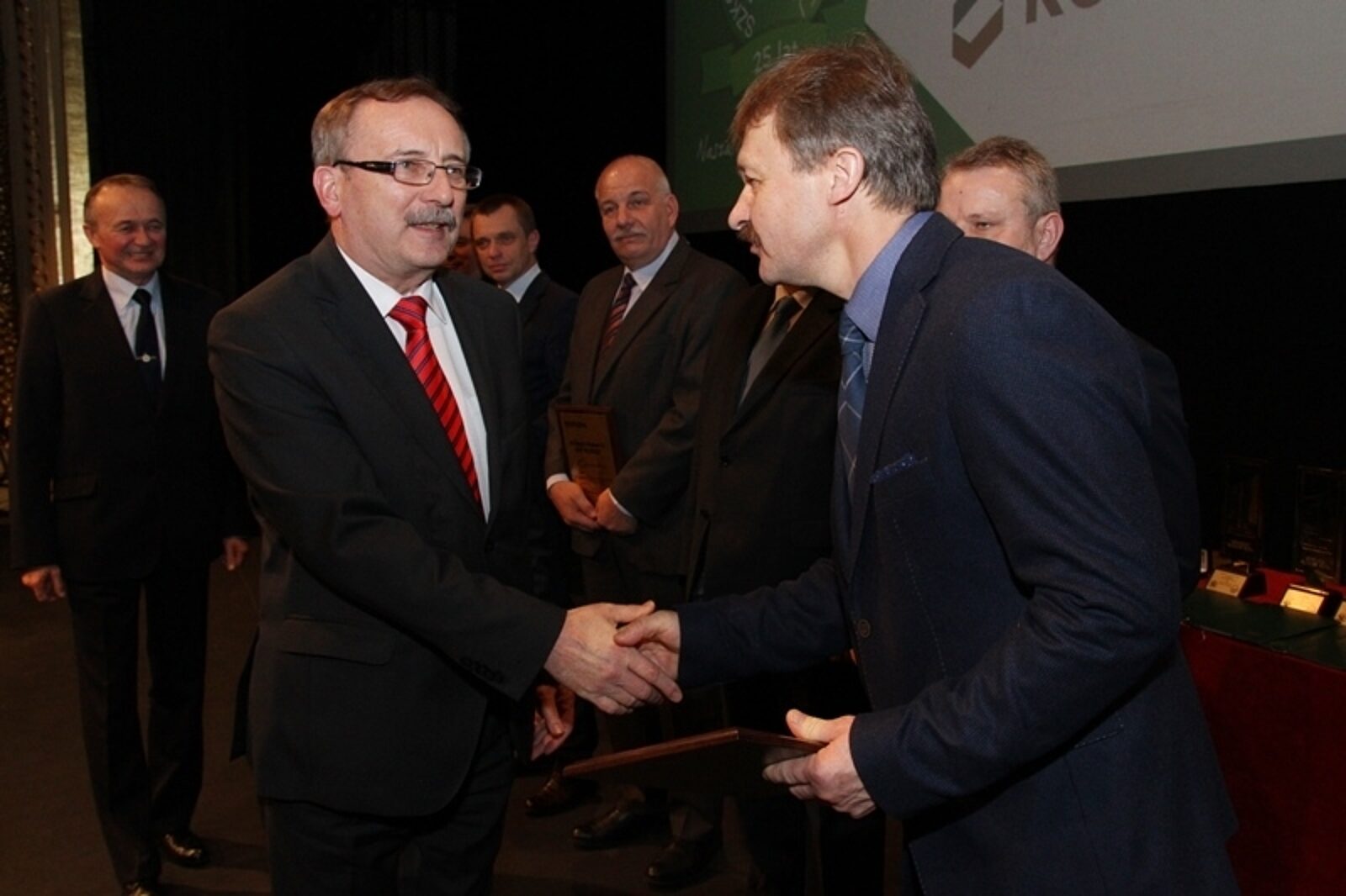 Dyrektor kopalni Jankowice Stanisław Konsek (po prawej) odbiera gratulacje od prezesa Wyższego Urzędu Górniczego Mirosława Koziury. Rybnicki zakład triumfował już po raz szósty w konkursie Bezpieczna Kopalnia