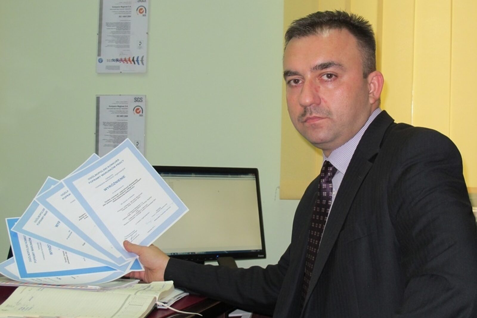 Grzegorz Jurkiewicz prezentuje wyróżnienia uzyskane przez kopalnię Halemba--Wirek podczas edycji Konkursu Poprawy Warunków Pracy w 2012 r.