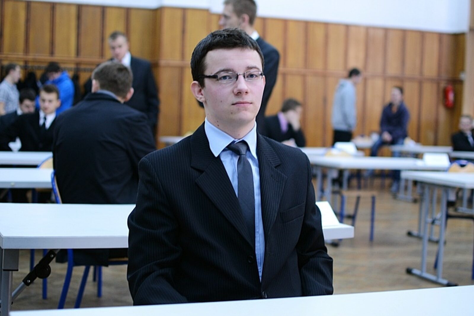 Finaliści tegorocznej olimpiady górniczej w towarzystwie Teresy Horst, dyrektorki PZS w Bieruniu oraz dr. Jana Kanii, przewodniczącego jury. fot.: arc.