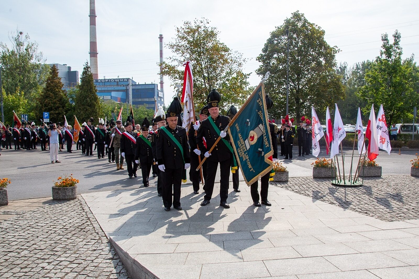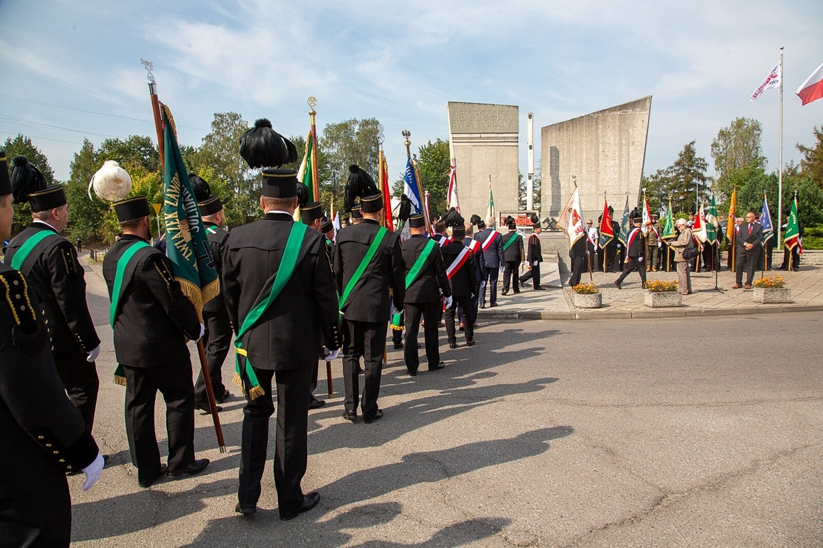 Kwiaty pod pomnikiem Porozumienia Jastrzębskiego składa lider górniczej Solidarności Bogusław Hutek w towarzystwie szefa „S” w JSW Sławomira Kozłowskiego