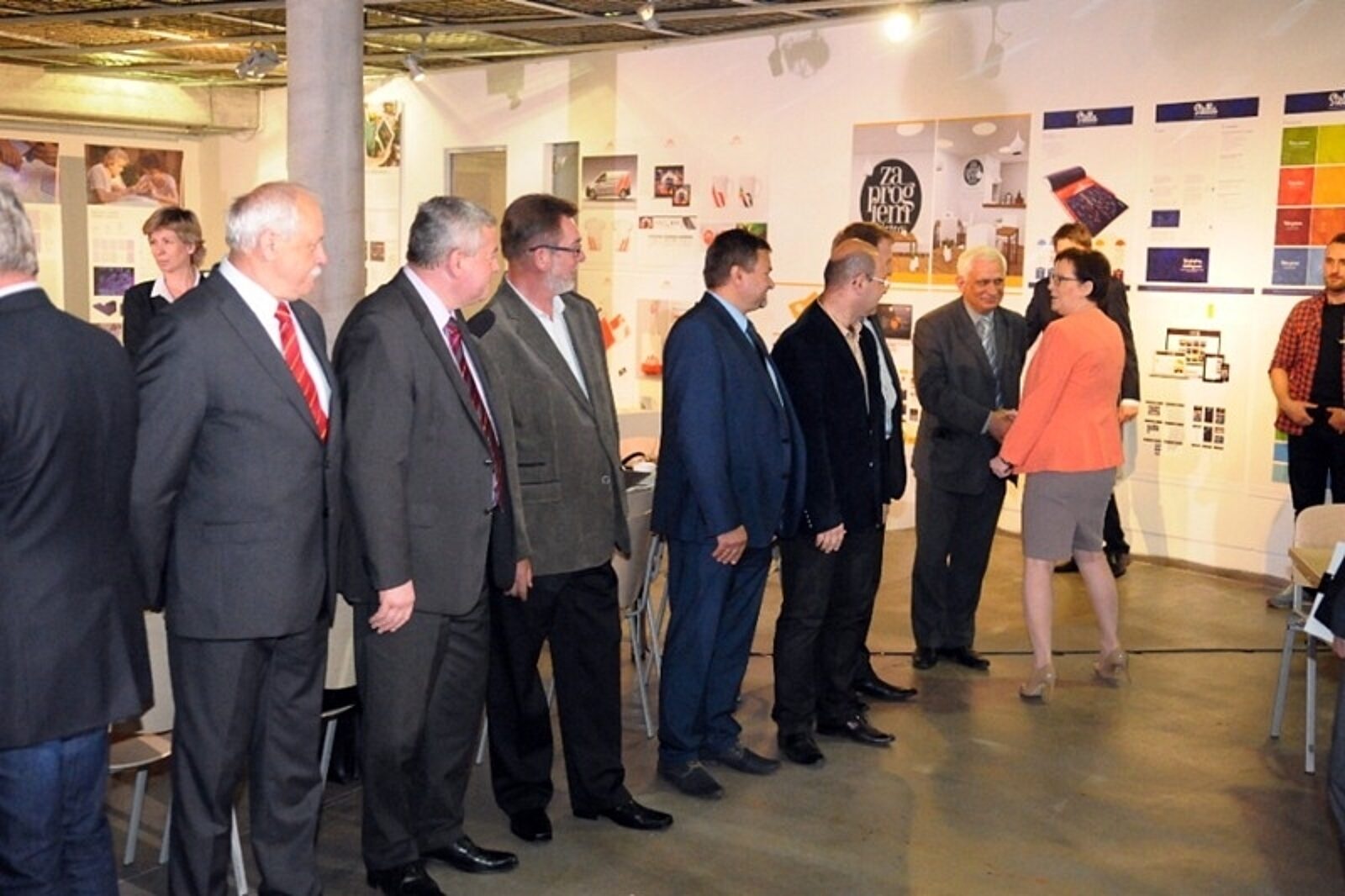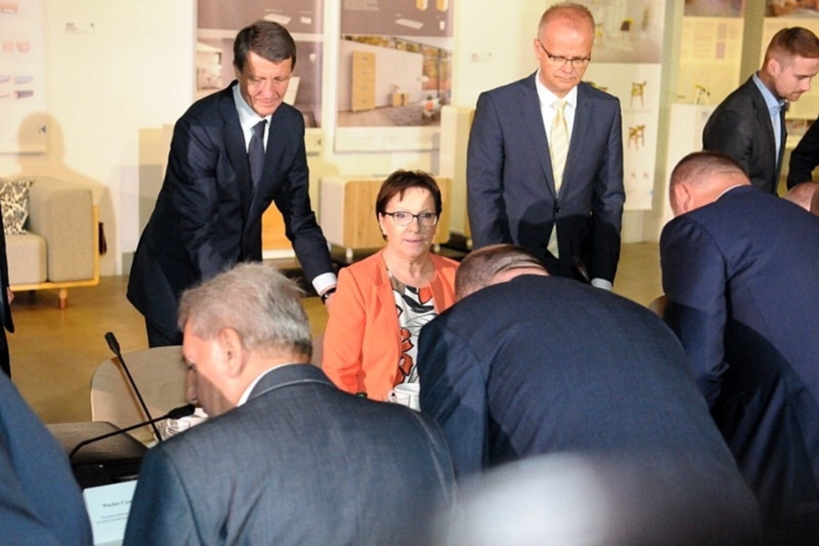 W spotkaniu górniczych związkowców z premier Ewą Kopacz biorą udział ministrowie Włodzimierz Karpiński (po lewej), Władysław Kośniak-Kamysz, Rafał Baniak, Mirosław Pietrewicz i Wojciech Kowalczyk (po prawej). Na sali jest prezes Kompanii Węglowej Krzysztof Sędzikowski, prezes SRK Marek Tokarz oraz wojewoda śląski Piotr Litwa
