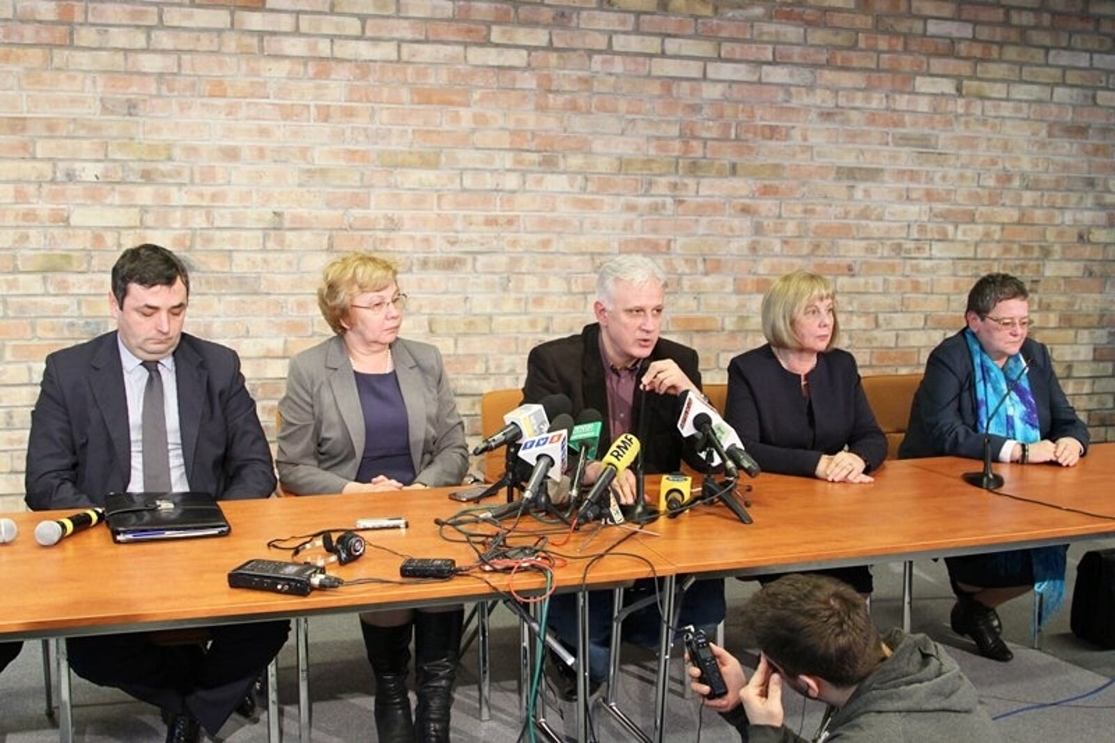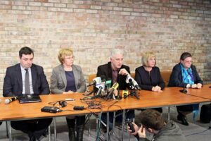 W briefingu po spotkaniu związkowcy-samorządowcy uczestniczyli m.in.: (od lewej) prezydent Bytomia Damian Bartyla, prezydent Zabrza Małgorzata Mańka-Szulik, lider śląsko-dąbrowskiej "S" Dominik Kolorz, prezydent Rudy Śląskiej Grażyna Dziedzic, burmistrz Brzeszcz Cecylia Ślusarczyk