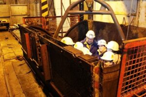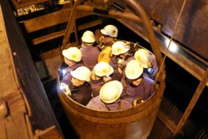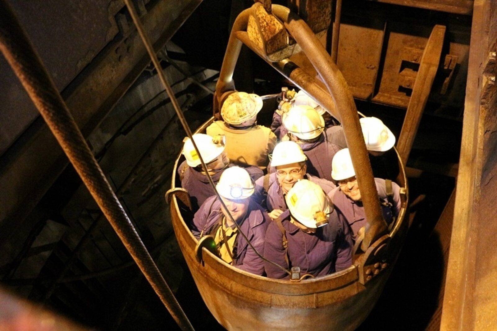 Przedstawiciele śląskiej prokuratury i sądownictwa posmakowali podróży w głąb ziemi w naczyniu szybowym, które górnicy zwykli nazywać kubłem lub kiblem