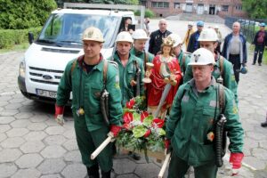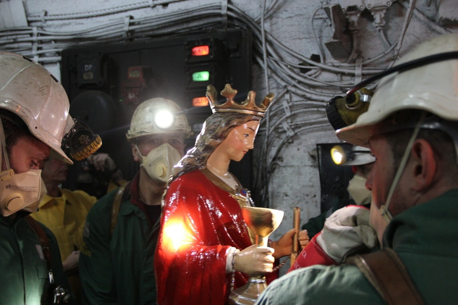 Figura patronki górników stała od lat na ołtarzu, 438 m pod ziemią. Została wytransportowana na powierzchnię w asyście ratowników górniczych.