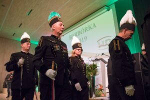 Wręczenia szpady dokonują Stare Strzechy, czyli zasłużeni górnicy i tak właśnie zgodnie z tradycją było w czasie akademii barbórkowej WUG.