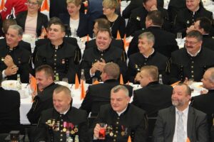 Po uhonorowaniu jubilatów i wyróżnionych pracowników odznakami "Zasłużony dla górnictwa" oraz szpadami i nowymi stopniami górniczymi, Tomasz Gawlik poprosił Grzegorza Tobiszowskiego o wzniesienie uroczystego toastu i rozpoczęcie barbórkowego obiadu. Przez szacunek i pamięć o górnikach z kopalni Rudna zrezygnowano z elementów rozrywkowych a biesiada przebiegała w godnej, stonowanej atmosferze.