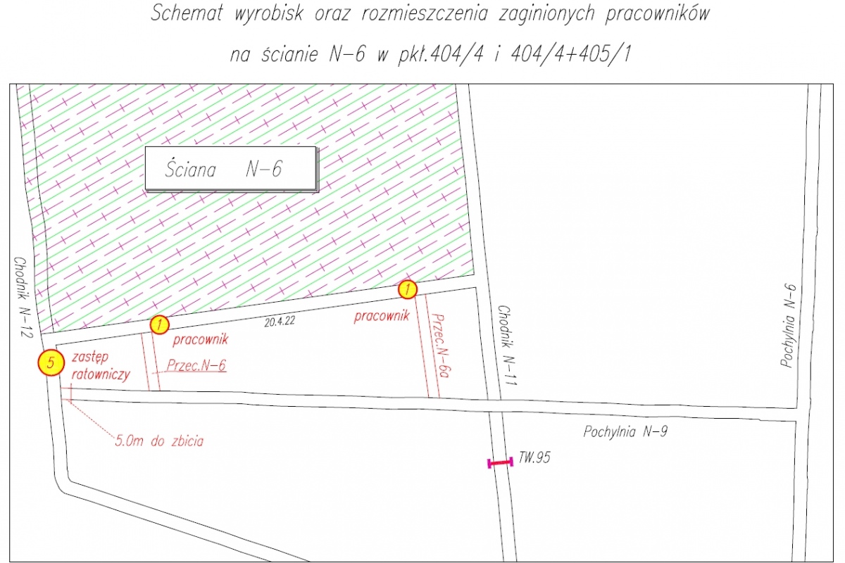 Przypomnijmy, że akcja ratownicza polegać będzie na zbiciu (połączeniu) nowo wydrążonego wyrobiska - pochylnia N-9 (równoległego do ściany N-6) z chodnikiem nadścianowym N-12, w okolicach miejsca, w którym prawdopodobnie znajduje się pięciu z siedmiu zaginionych górników. Zanim jednak dojdzie do połączenia obu wyrobisk, ratownicy rozpoczną przewietrzanie wyrobisk przez specjalnie wywiercone otwory w czole przodka pochylni N-9.
