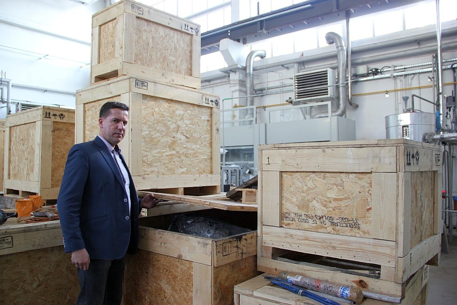 Dr Krzysztof Kapusta z KD Barbara prezentuje ogromne skrzynie, w których bryły węgla z Walii przyjechały do Mikołowa