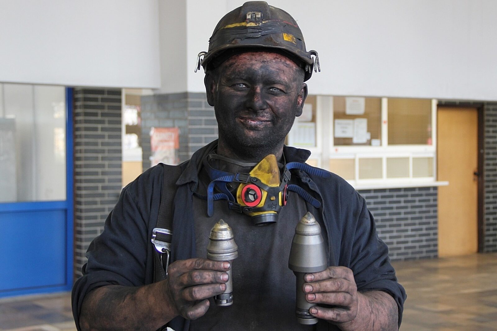 Kombajnista Oddziału G-1z prezentuje noże organu urabiającego kombajnów. Ten z prawej służy do urabiania węgla w ścianie N-4
