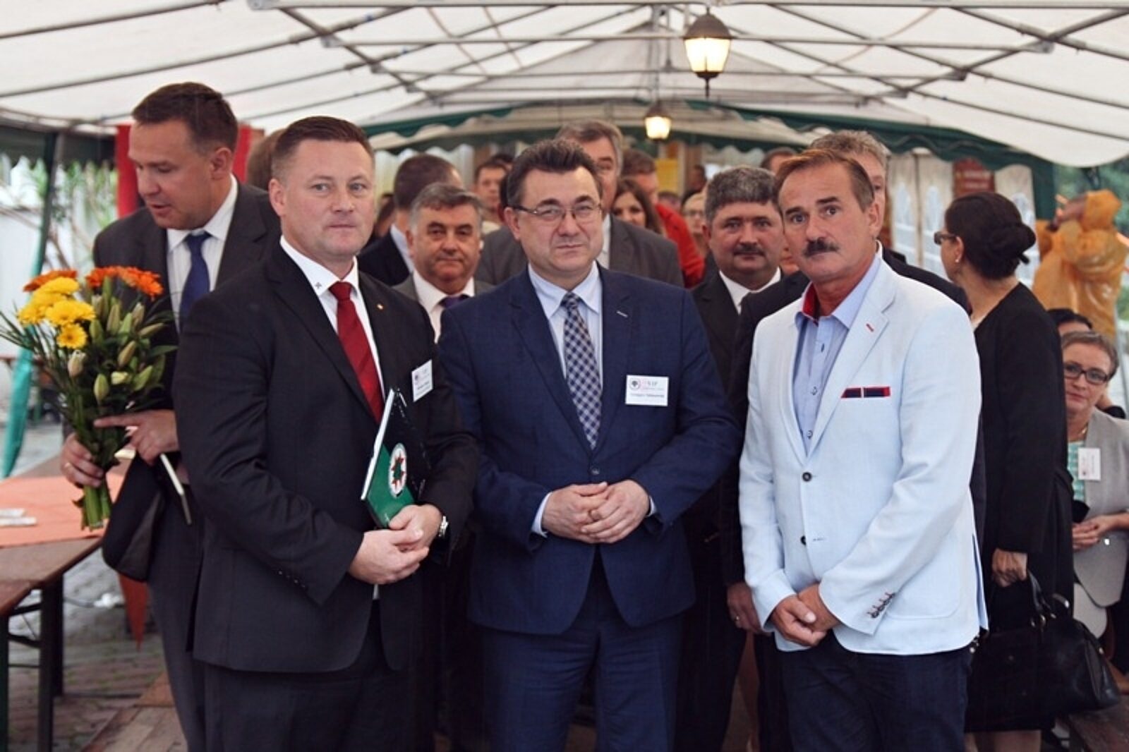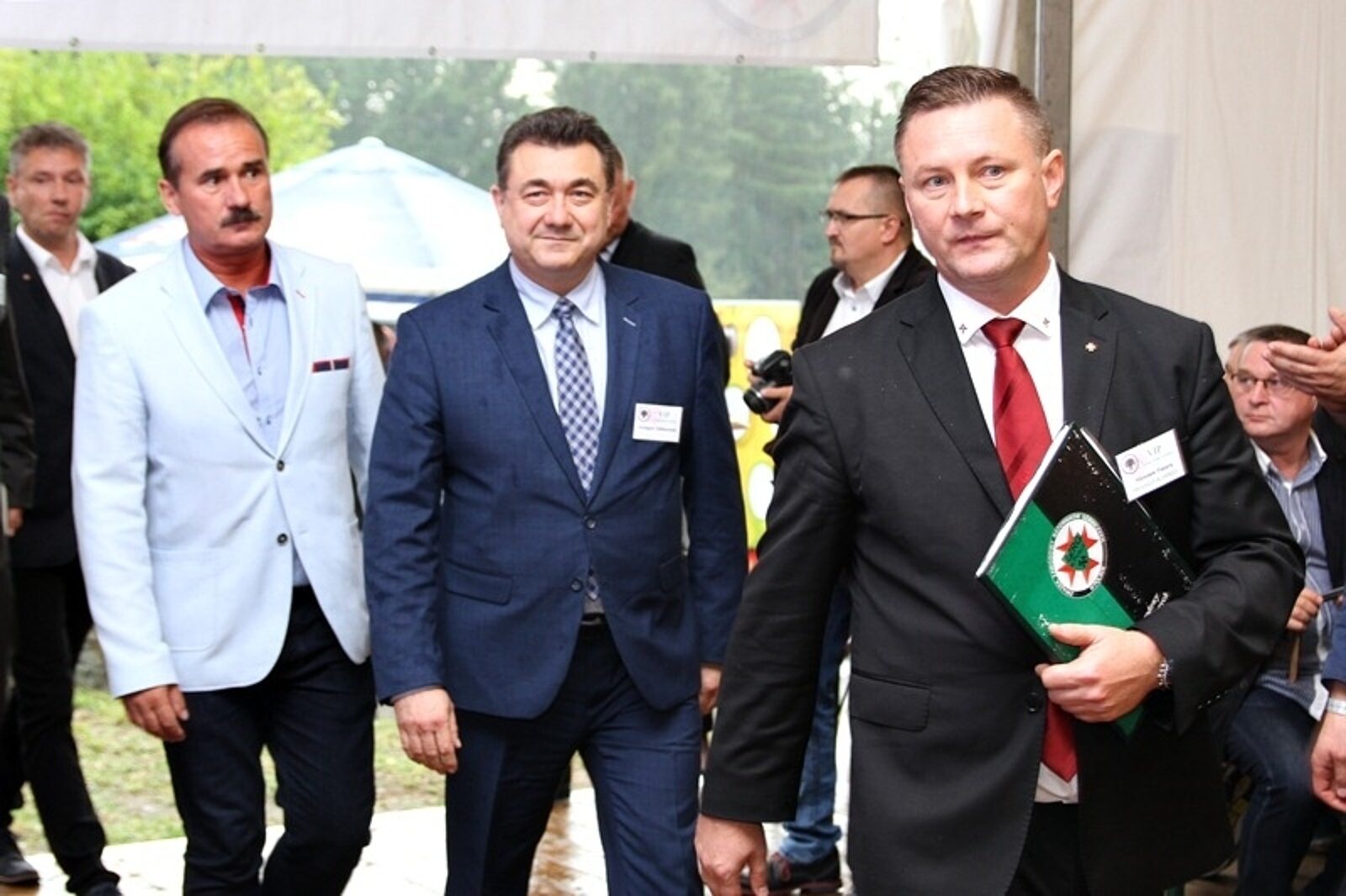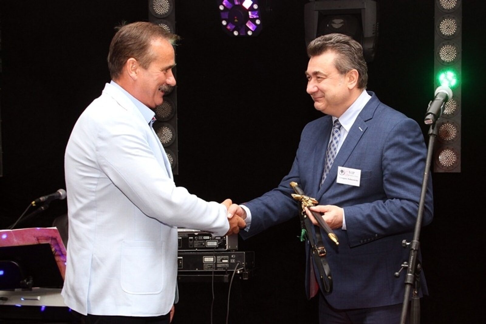 Przewodniczący ZZRG Piotr Luberta (po lewej) wręcza wiceministrowi energii Grzegorzowi Tobiszowskiegmu sztylet ratowniczy