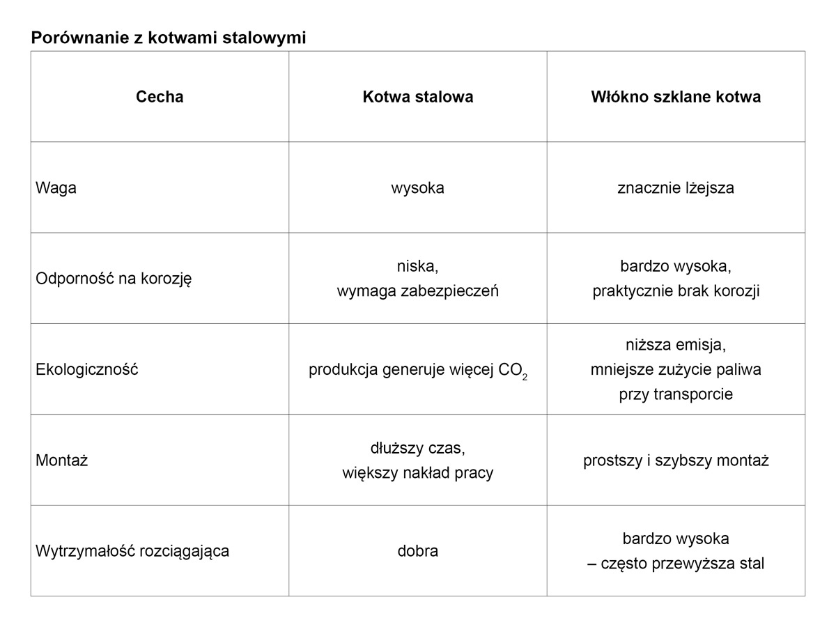 3. Odporność na korozję – włókno szklane jest odporne na działanie czynników atmosferycznych, chemicznych i korozyjnych, co przedłuża żywotność kotwy i zmniejsza koszty konserwacji.