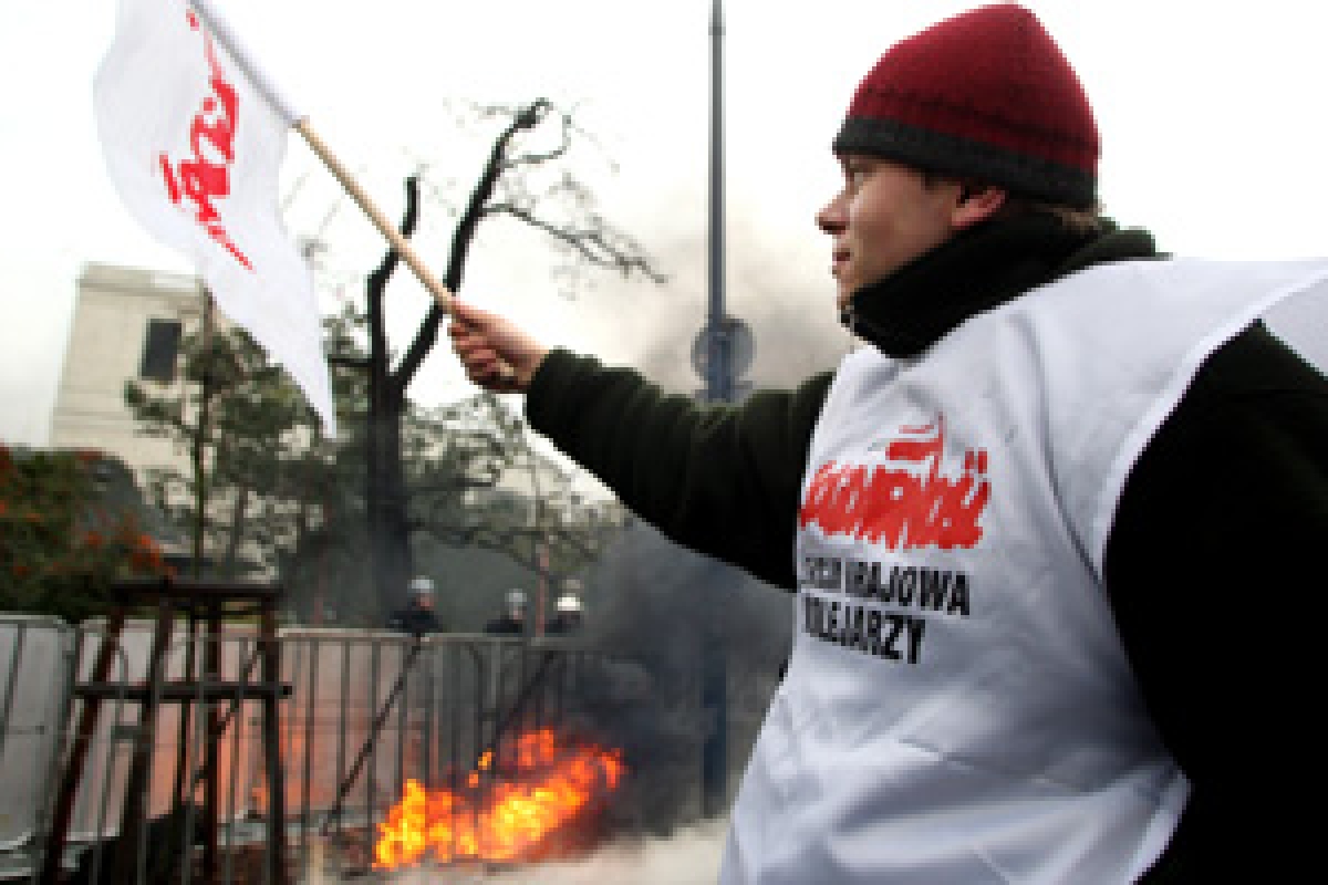 Związkowcy znowu pod Sejmem: Płonęła trumna PO