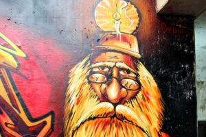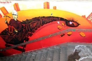 Drugie graffiti przedstawia postać legendarną, czyli Skarbnika. Starzec z długą brodą, dzierżąc kilof w dłoni, pilnuje skarbów ziemi i spogląda na podróżnych kierujących się w stronę peronu.
