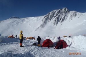 W obozie "czternastka" nasi wspinacze zorganizowali bazę główną, rozstawiając dwa namioty. Następnie zabrali się za budowę lodowych "wałów" ochronnych, zabezpieczających przed silnym wiatrem i nawiewaniem śniegu. Kolejnego dnia wynieśli niezbędny sprzęt na grań West Buttress.