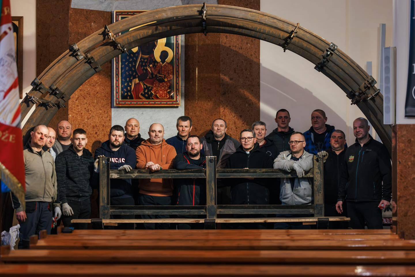 Praca jest ciężka, same trzy ringi obudowy, które trzeba postawić do pionu łącznie ważą około 600 kilogramów. Figura Chrystusa położona będzie na drzewiarce w otoczeniu obudowy chodnikowej.