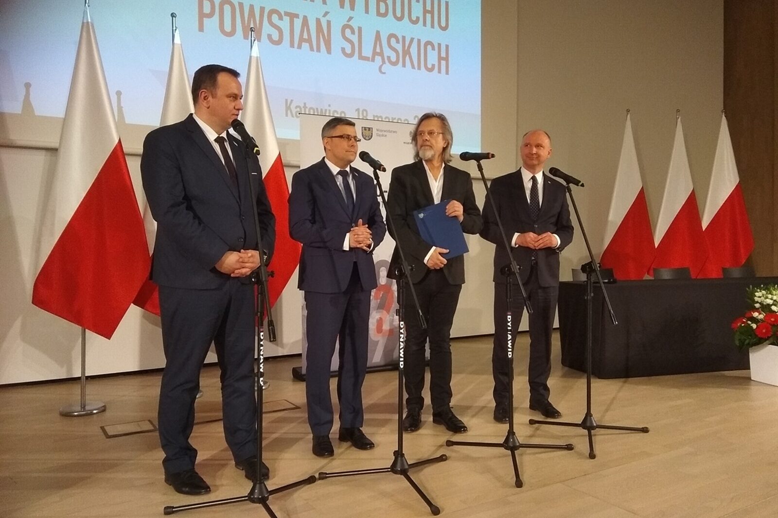 Na zdjęciu: Jakub Chełstowski, marszałek śląski, Jarosław Wieczorek, wojewoda śląski, Jan A.P. Kaczmarek, kompozytor i Wojciech Kolarski, podsekretarz stanu w Kancelarii Stanu Prezydenta RP, opowiadają o obchodach stulecia powstań śląskich