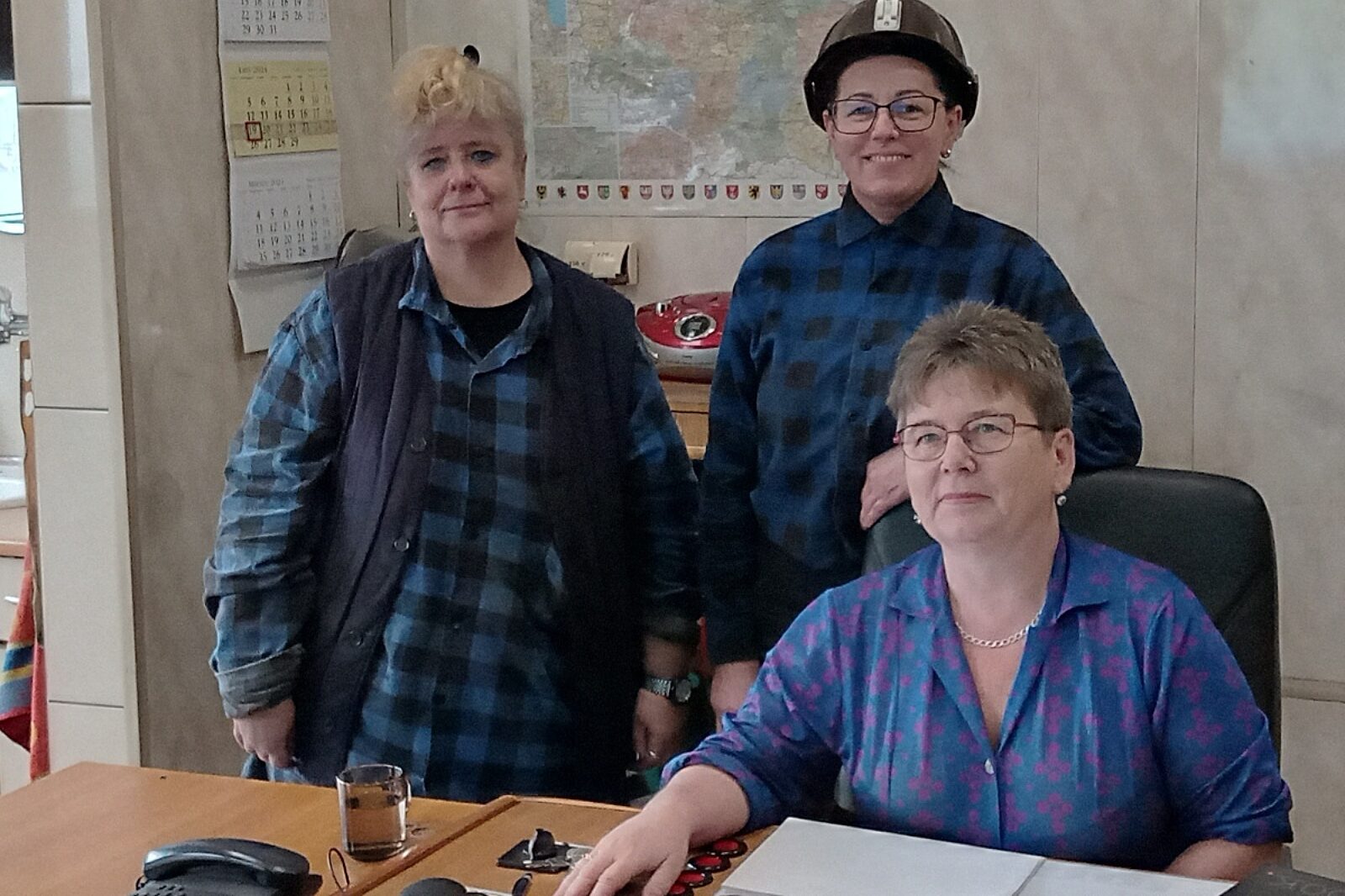 Na przeróbce kobiet nigdy nie brakowało. Tak też jest w kopalni Bolesław Śmiały. Od lewej stoją: Joanna Golda i Dorota Niziałek. Przy pulpicie dyspozytorskim siedzi Barbara Filip