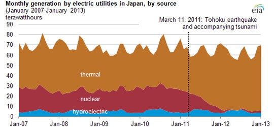 Po awariach w Fukushimie Japonia zaczęła zamykać swoje reaktory jadrowe i musiała błyskawicznie przestawić się na spalanie ropy naftowej, by zapewnić bezpieczeństwo energetyczne kraju. Jednakże proces zastępowania siłowni nuklearnych jest wyjątkowo kosztowny, dlatego też rząd Japonii w celu poprawienia konkurencyjności gopodarki państwa postanowił odważniej korzystać z węgla. Planuje się uruchomienie w 2014 r. 14 nowych elektrowni opalanych gazem i węglem.