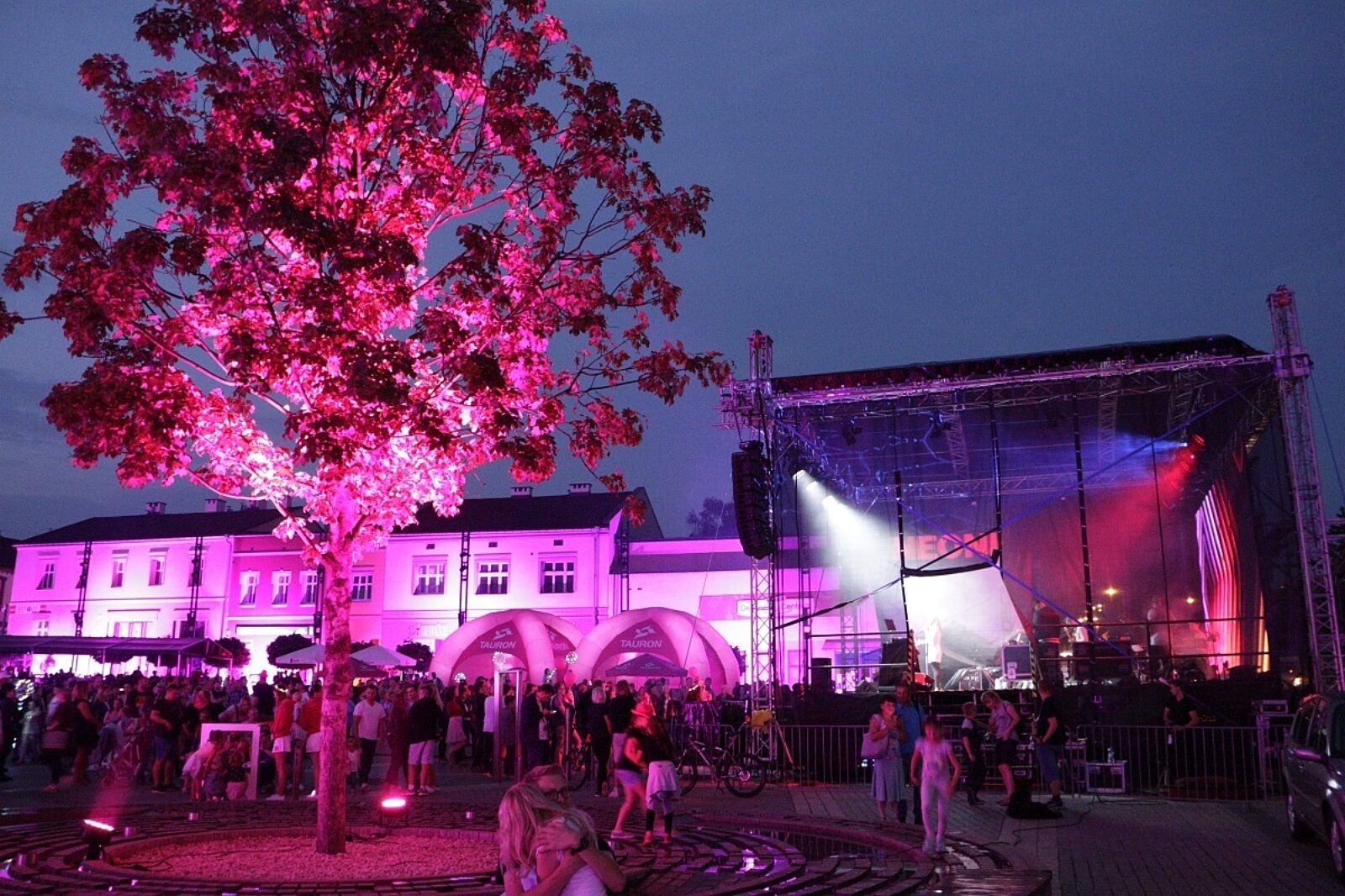 Po zmroku w sobotę rynek w Jaworznie zatonął w barwach Taurona - mieszkańcy radośnie świętowali jubileusz 120 lat energetyki w mieście