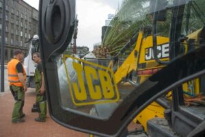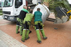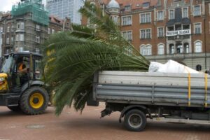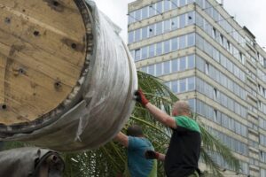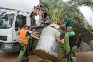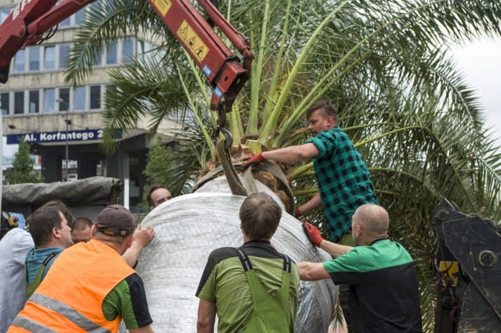 Niełatwo było zdjąć z ciężarówki półtorej tony ziemi i palmy i postawić to wszystko na miejscu