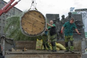 Najtrudniejszy jest pierwszy krok. Tak też było i z pierwszą palmą. Minęło dobre pół godziny, gdy wieloosobowej ekipie z miejskiego przedsiębiorstwa zieleni miejskiej udało się (bez szkody dla palmy) ostatecznie postawić donicę z palmą.