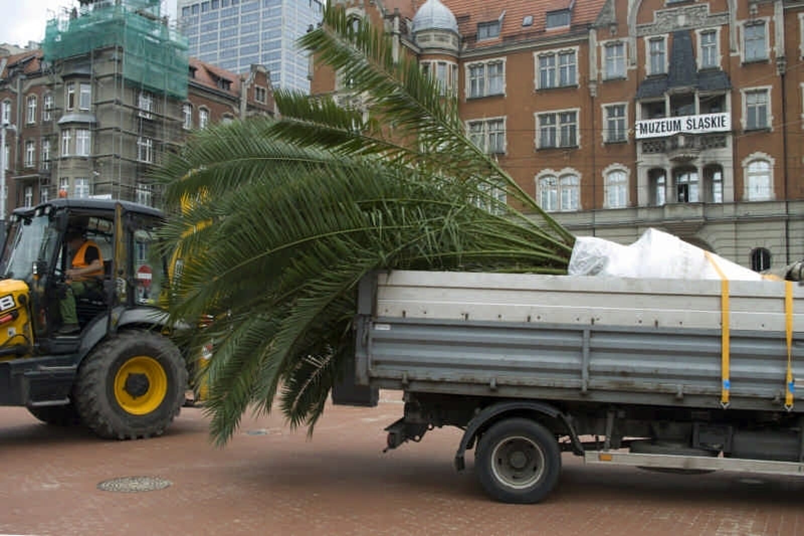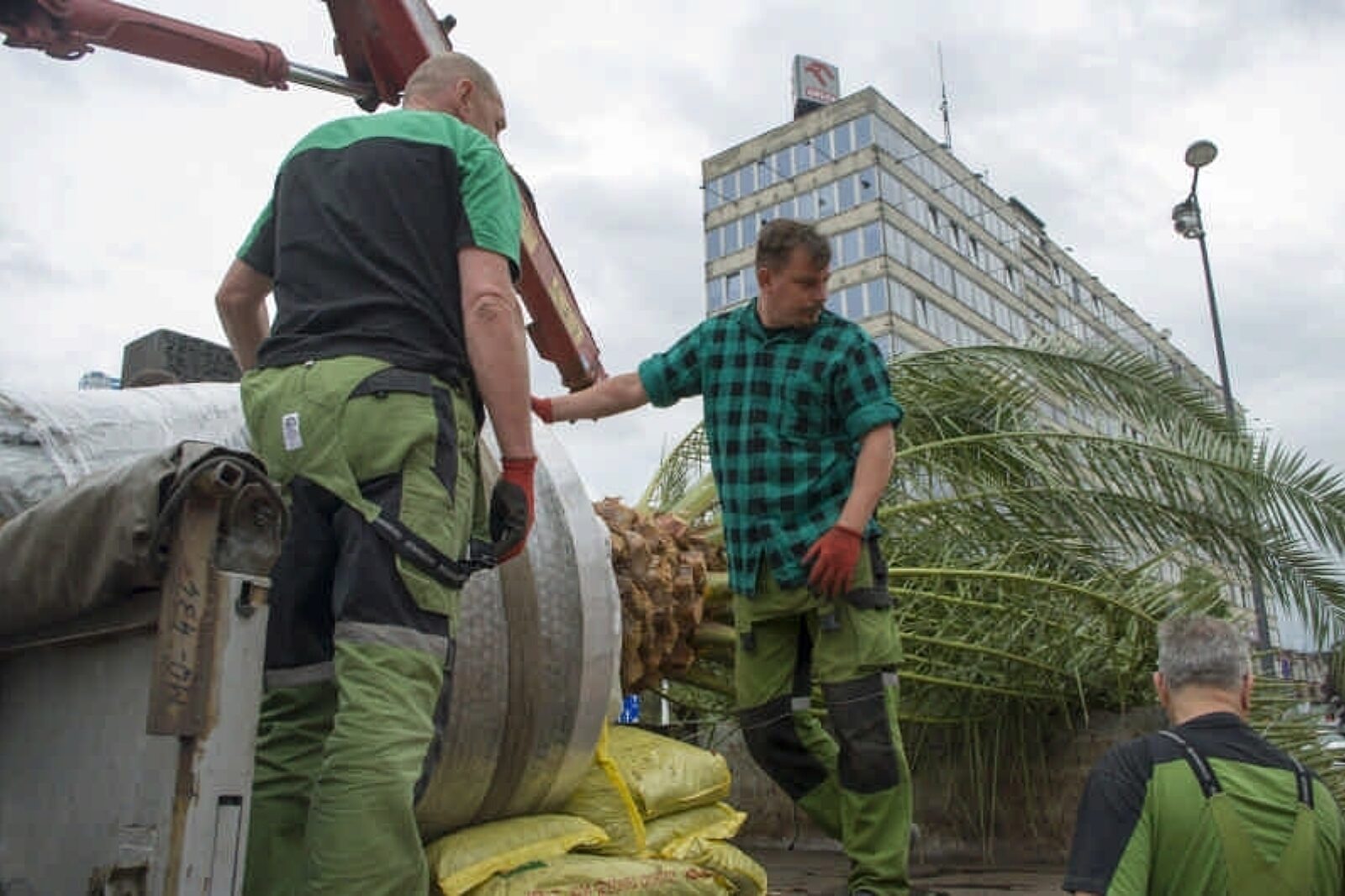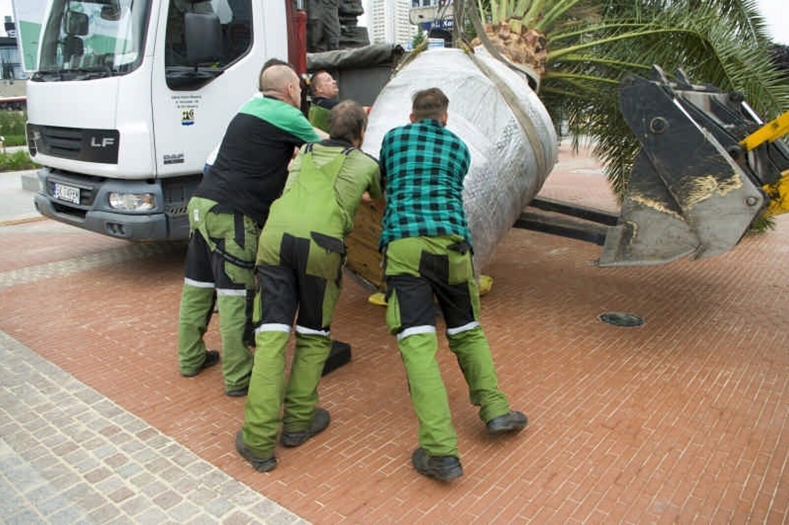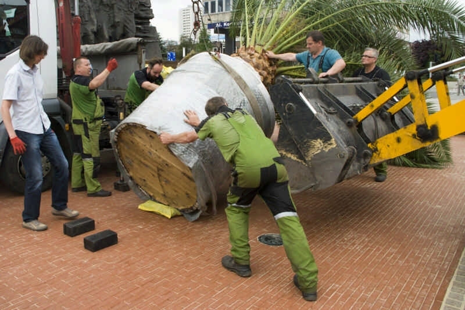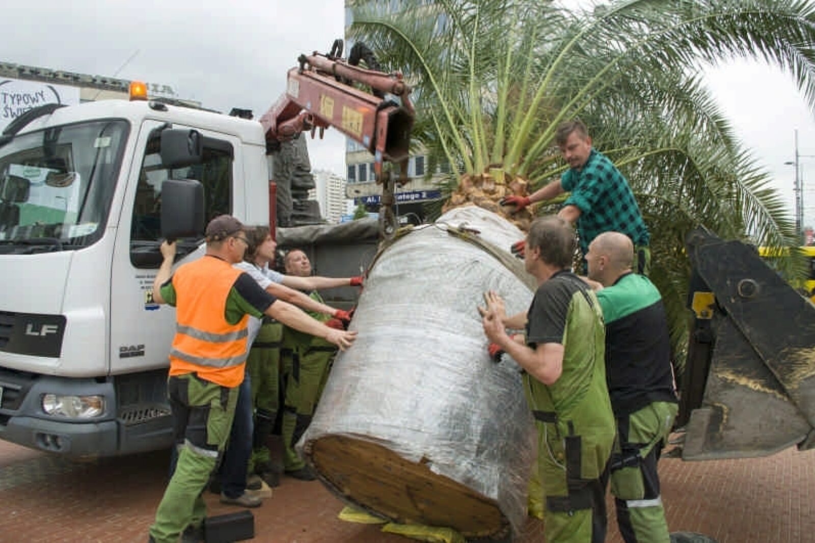 Niełatwo było zdjąć z ciężarówki półtorej tony ziemi i palmy i postawić to wszystko na miejscu
