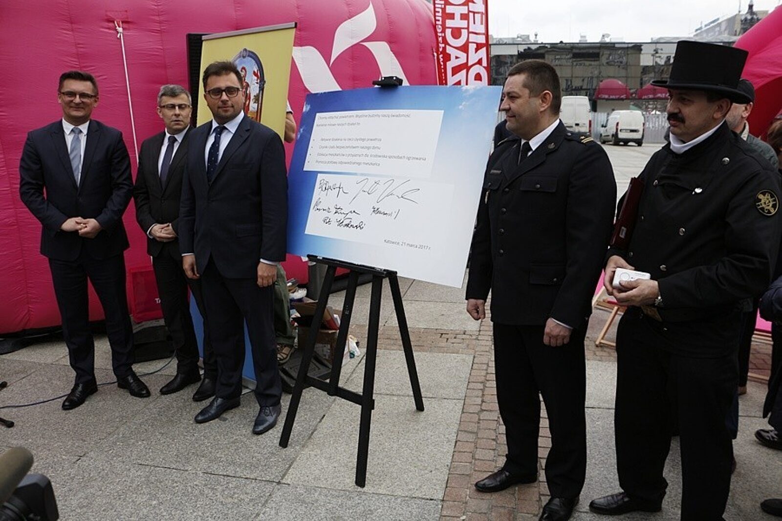 Podczas inauguracji programu "Oddychaj powietrzem" goście symbolicznie podpisali się na katowickim rynku pod planem walki ze smogiem