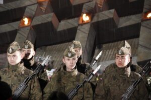 Pod pomnikiem-krzyżem Dziewięciu z Wujka odczytano apel poległych, a żołnierze oddali trzykrotnie w powietrze salwę honorową.