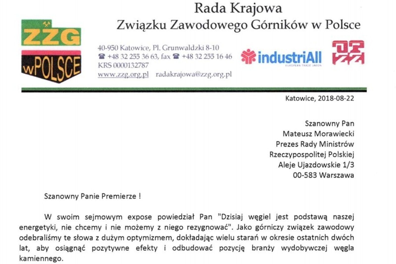 „Na próby całkowitego wyeliminowania węgla kamiennego z procesu indywidualnego użytkowania przez mieszkańców nie wyrażamy zgody, albowiem jest to działanie tożsame z likwidacją naszych miejsc pracy” - piszą w liście do premiera RP związkowcy ze Związku Zawodowego Górników w Polsce.