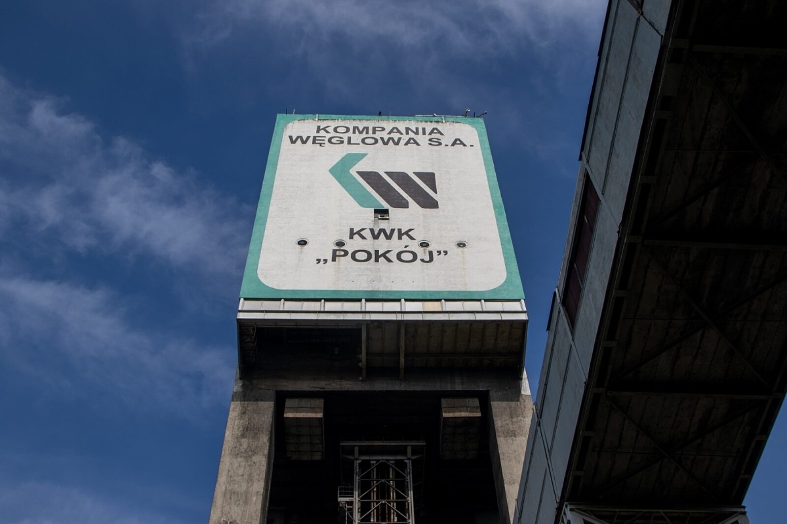 Na wieży szybu Wanda likwidowanej kopalni Pokój ciągle widnieje logo nieistniejącej już Kompanii Węglowej
