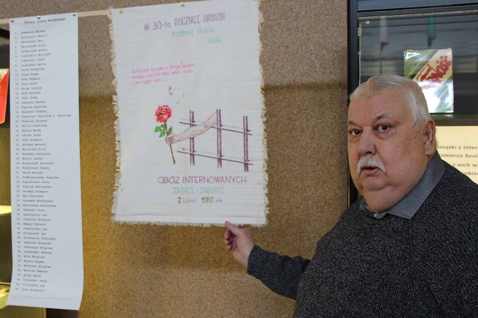 Kazimierz Szaliński prezentuje kolekcję pamiątek z okresu stanu wojennego wystawioną w cechowni kopalni Bobrek