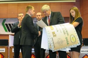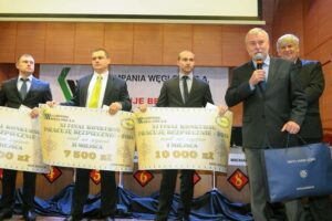 Na podium obok Wojciecha Hanuska stanęli Adam Myśliwiec z kopalni Marcel, który zajął drugie miejsce oraz Mateusz Plaszczymąka, który uplasował się na miejscu trzecim. Nagrody zwycięzcom wręczył wiceprezes KW Piotr Rykala (pierwszy z prawej). Zmagania obserwował Wojciech Magiera, wiceprezes Wyższego Urzędu Górniczego (pierwszy z lewej)