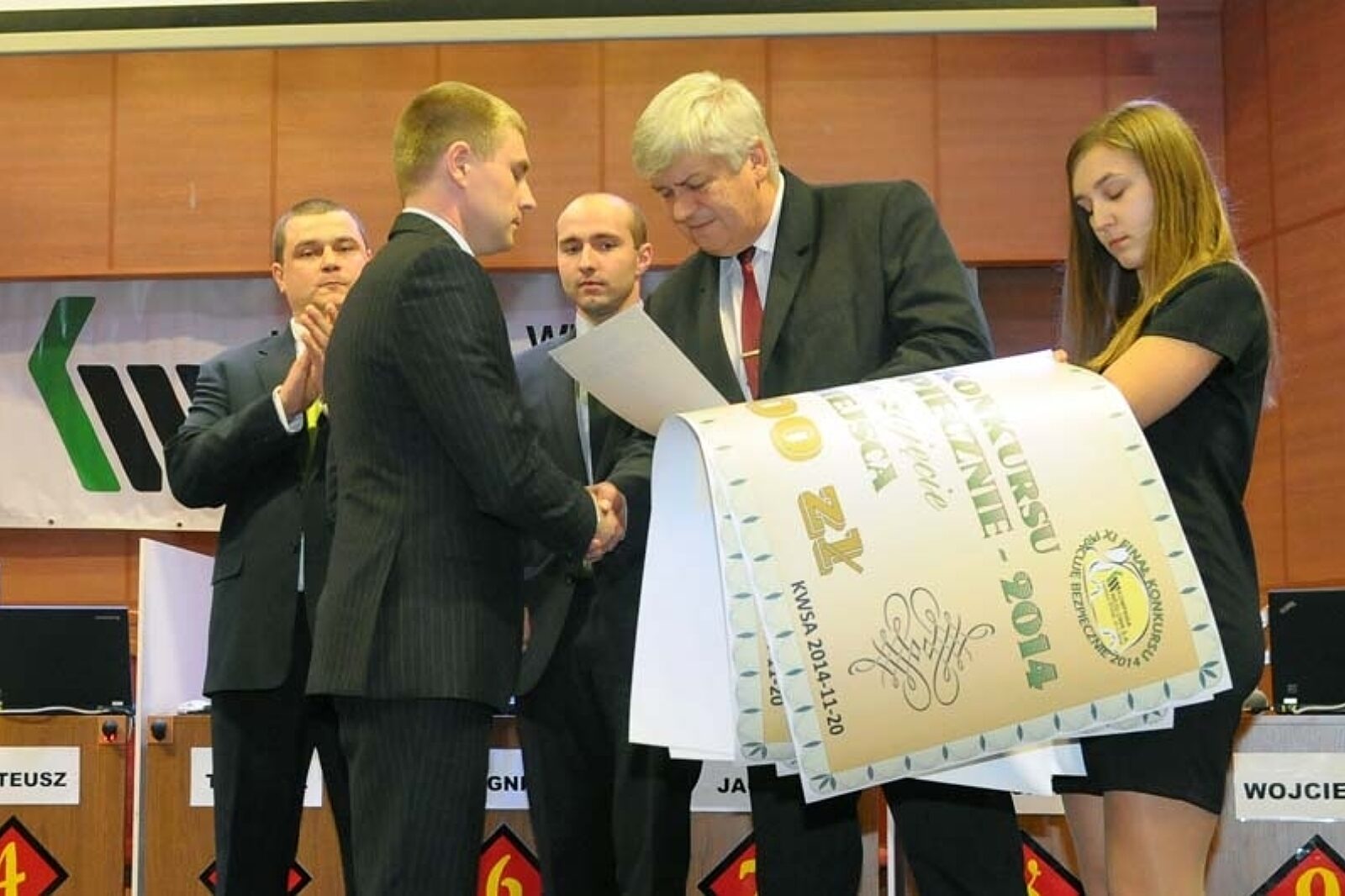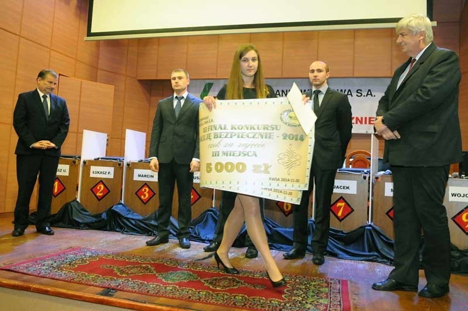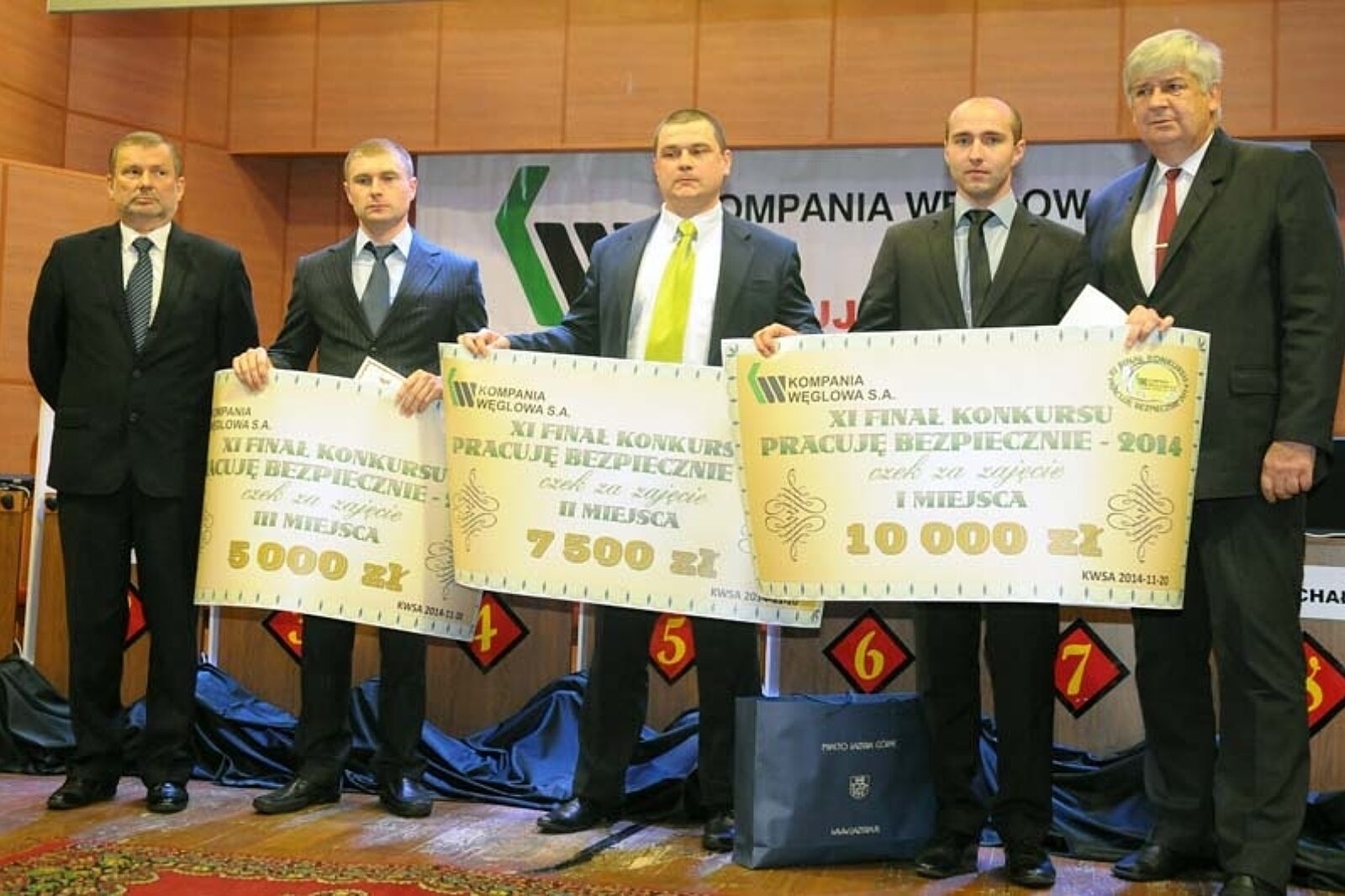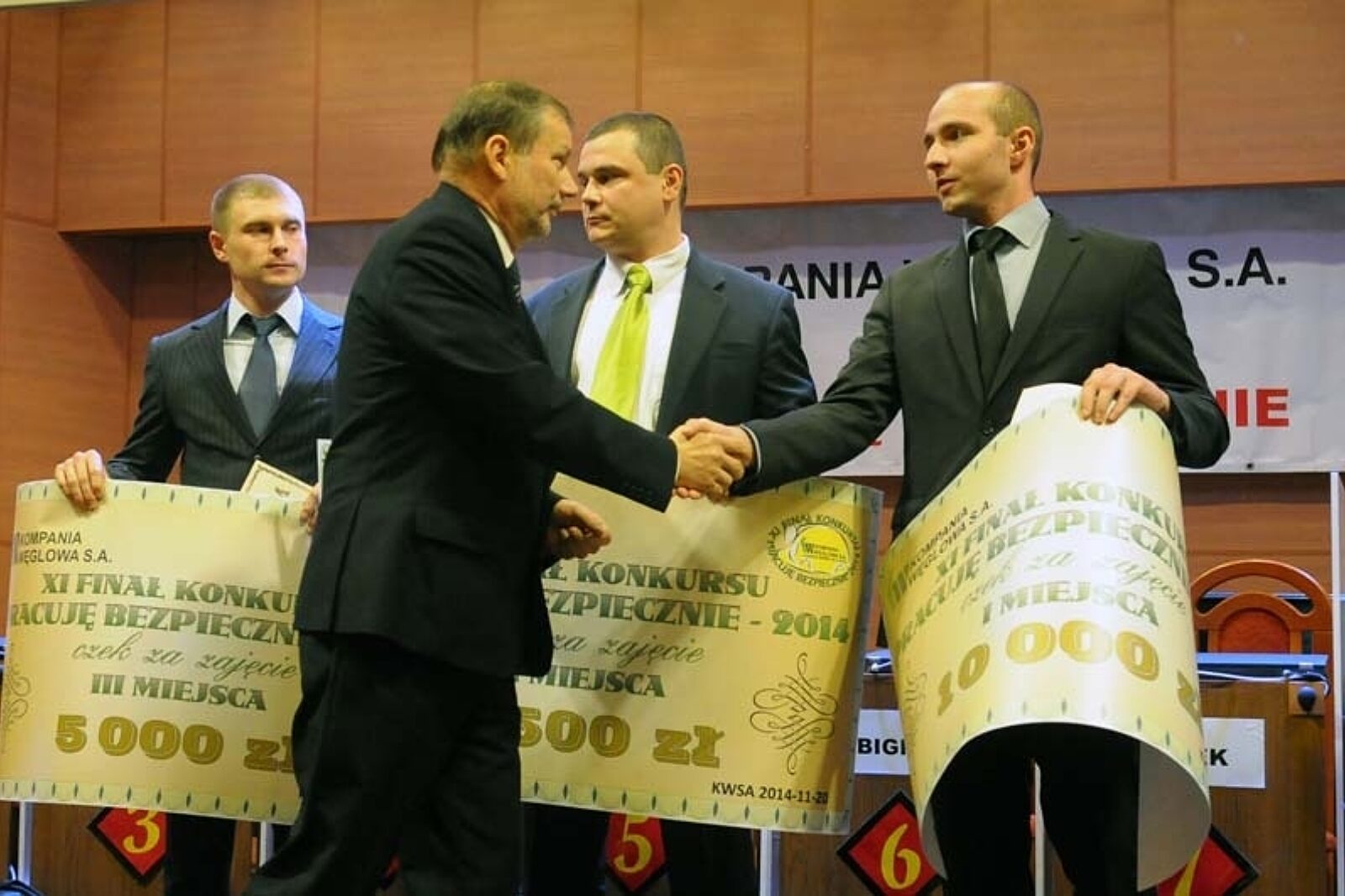 Na podium obok Wojciecha Hanuska stanęli Adam Myśliwiec z kopalni Marcel, który zajął drugie miejsce oraz Mateusz Plaszczymąka, który uplasował się na miejscu trzecim. Nagrody zwycięzcom wręczył wiceprezes KW Piotr Rykala (pierwszy z prawej). Zmagania obserwował Wojciech Magiera, wiceprezes Wyższego Urzędu Górniczego (pierwszy z lewej)