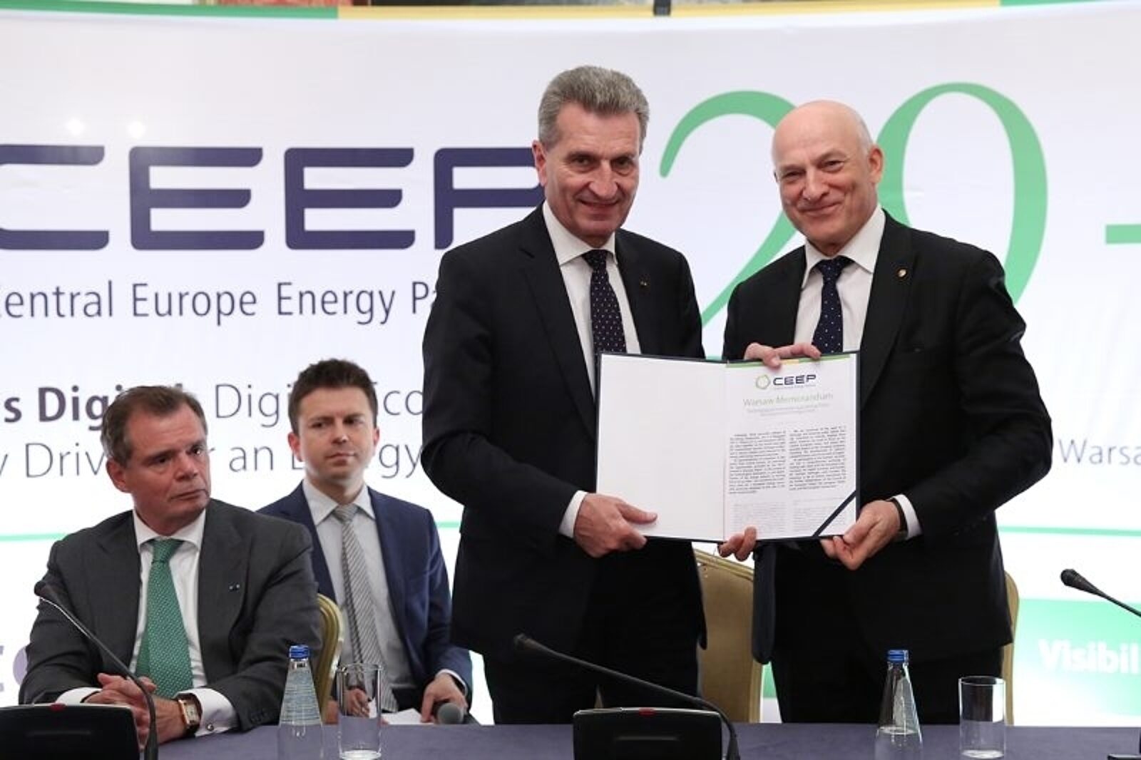 Pawła Olechnowicza wręcza Güntherowi Oettingerowi, komisarzowi europejskiemu ds. cyfrowej gospodarki i społeczeństwa, Memorandum Warszawskie